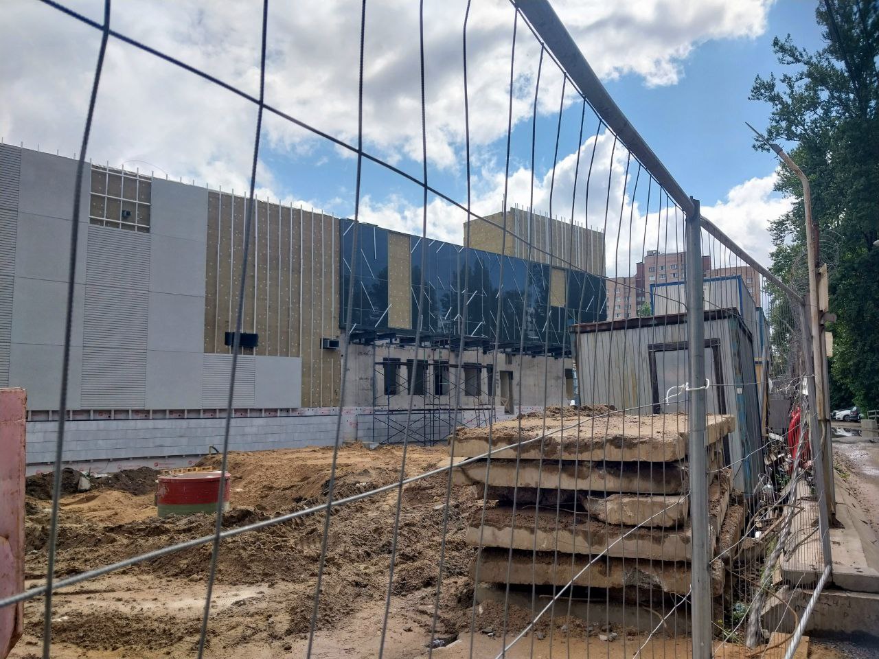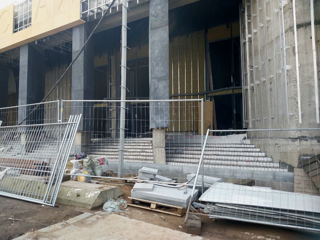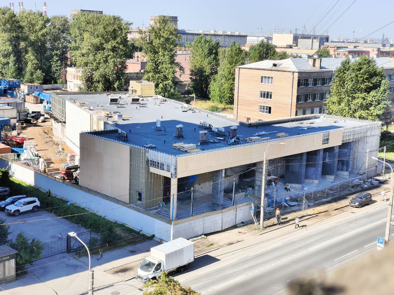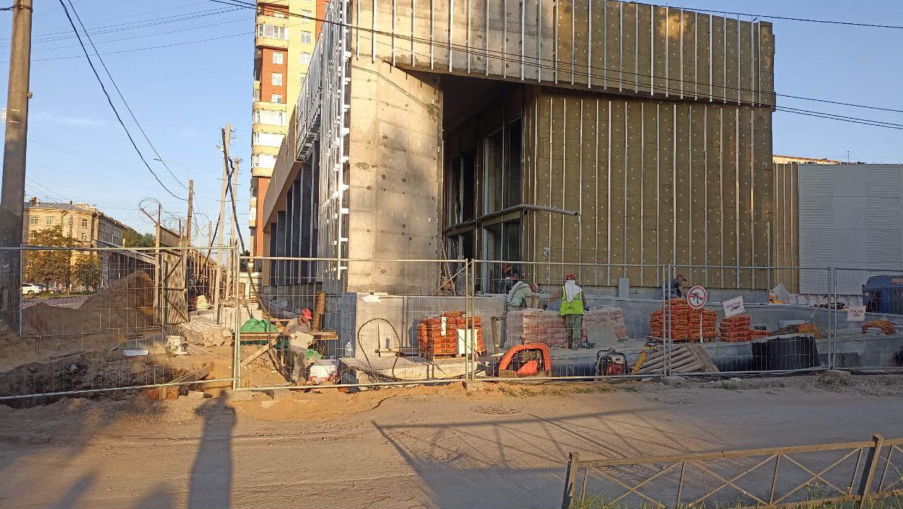 Со стороны проезда между вестибюлем и ДК имени И.И. Газа идёт установка стеклянных фасадных панелей тёмно-серого цвета, а также прозрачных панелей в оконные проёмы.