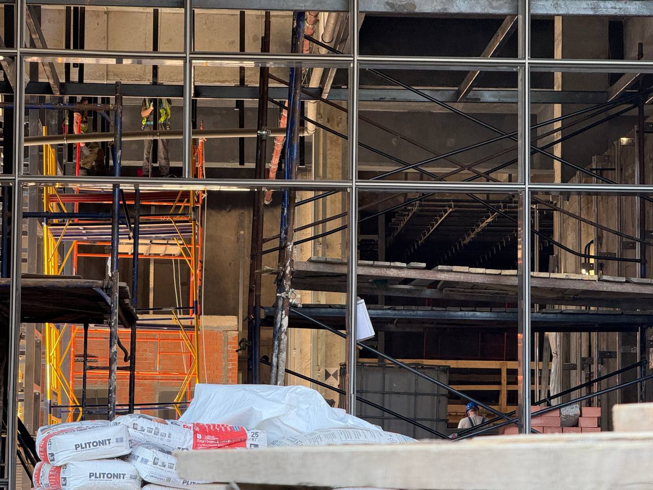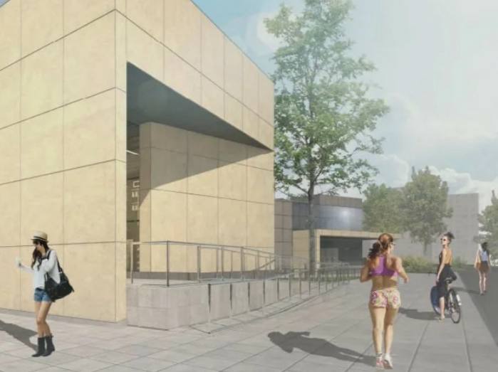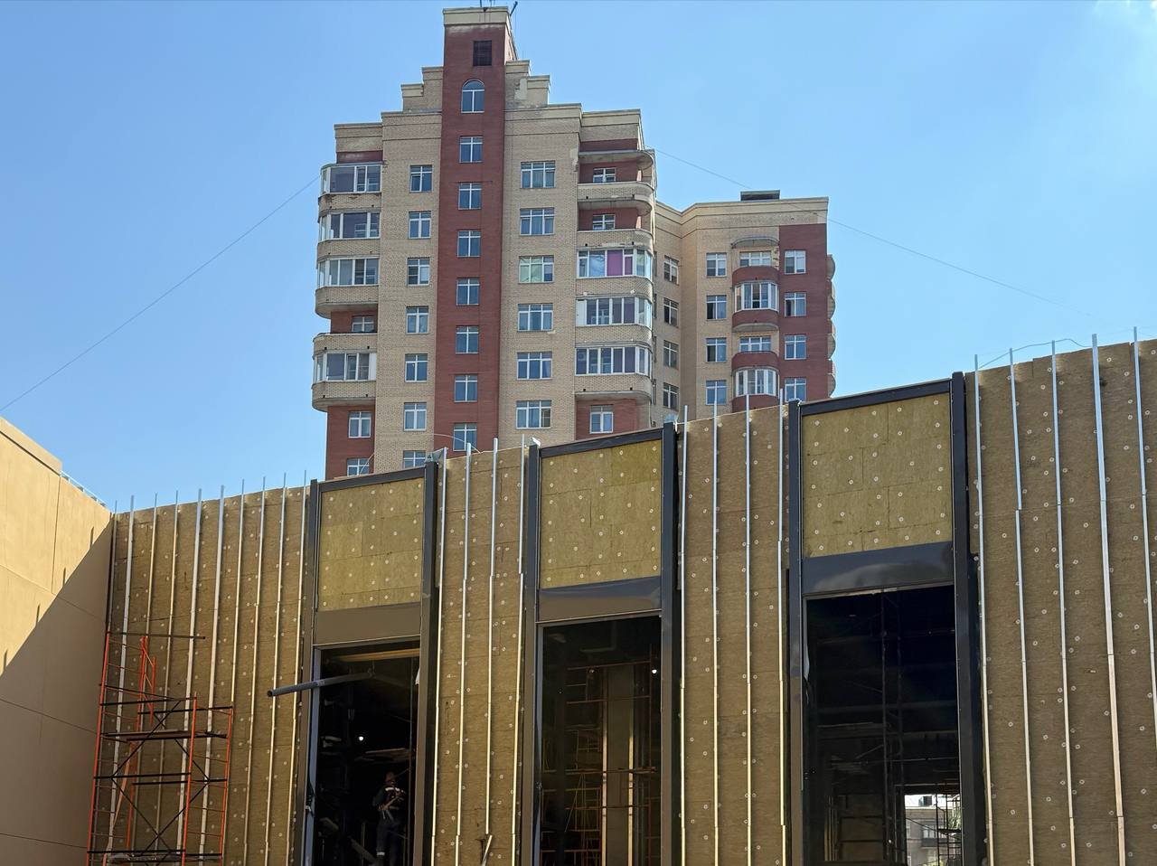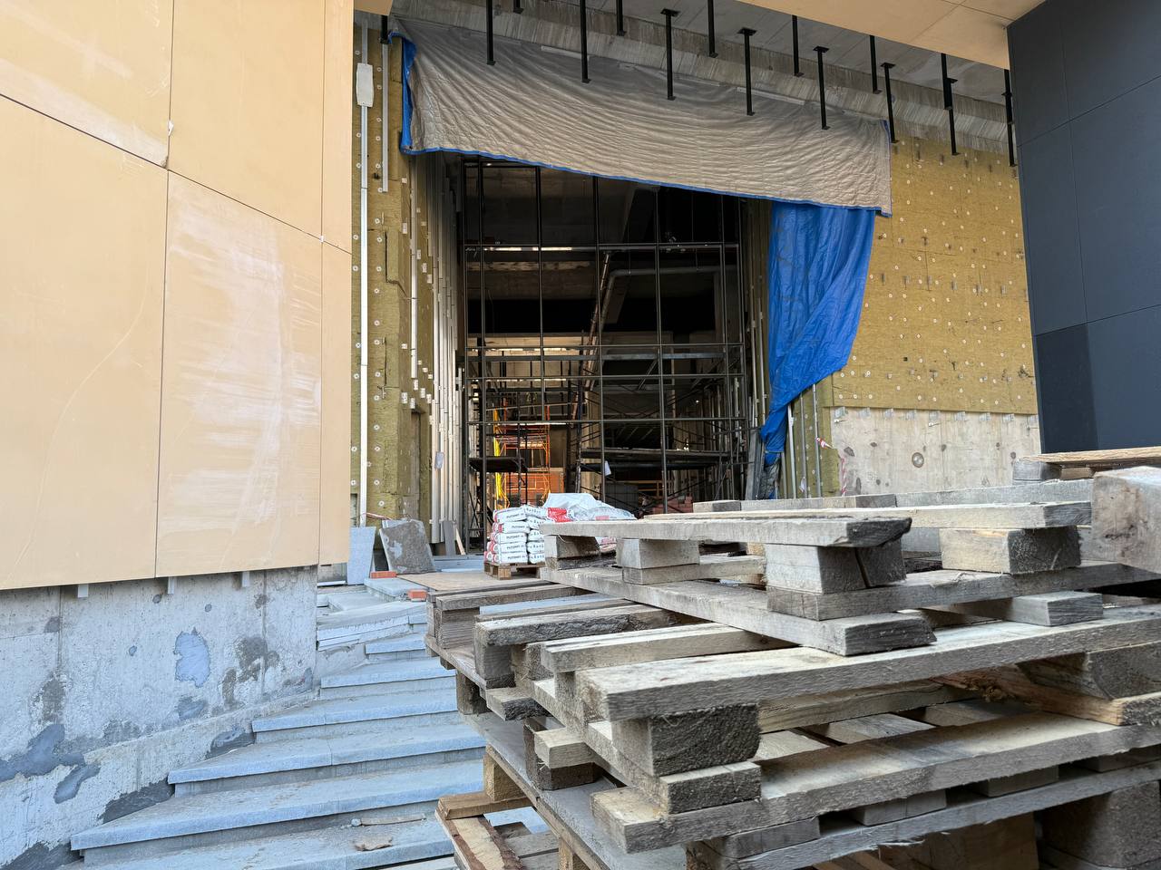 Со стороны проезда между вестибюлем и ДК имени И.И. Газа идёт установка стеклянных фасадных панелей тёмно-серого цвета, а также прозрачных панелей в оконные проёмы.
