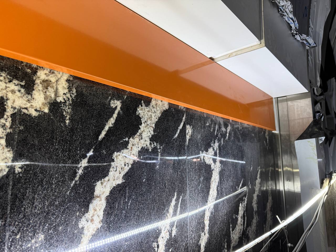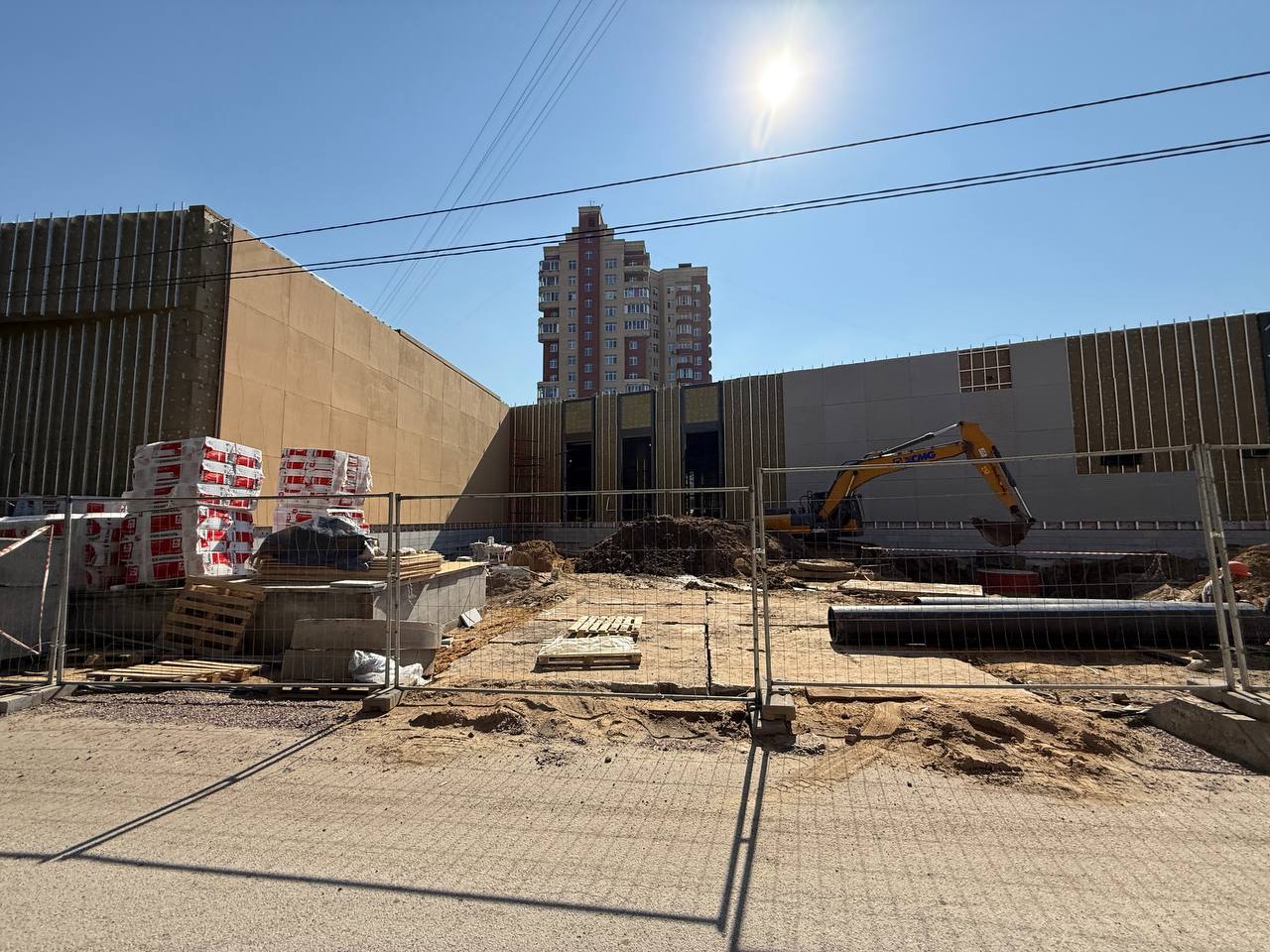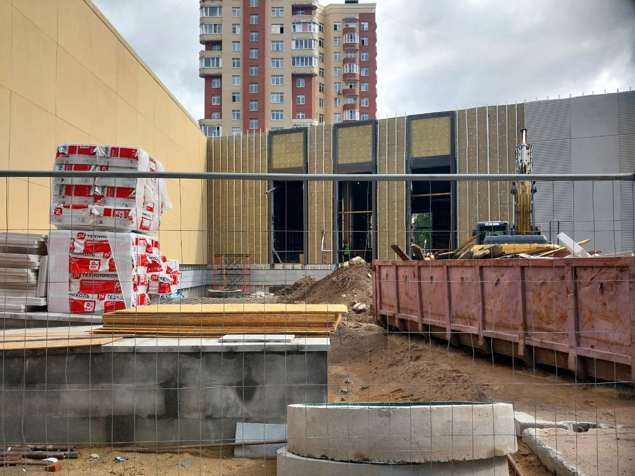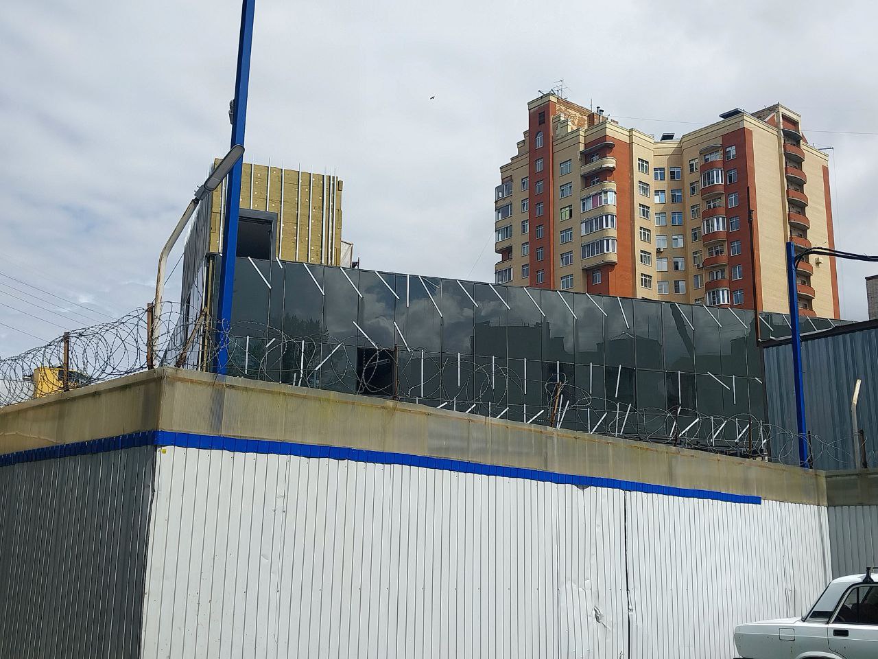 Со стороны проезда между вестибюлем и ДК имени И.И. Газа идёт установка стеклянных фасадных панелей тёмно-серого цвета, а также прозрачных панелей в оконные проёмы.