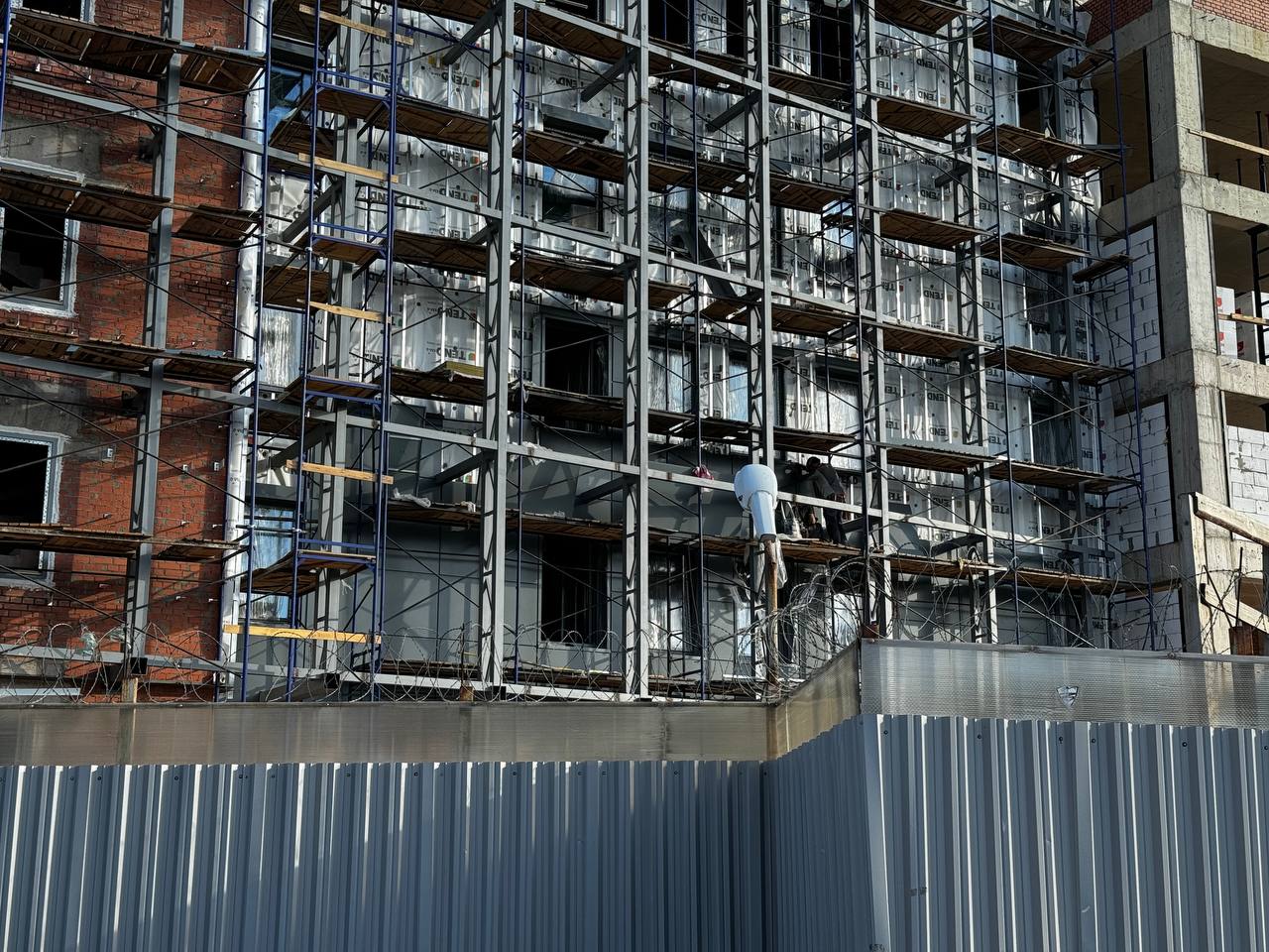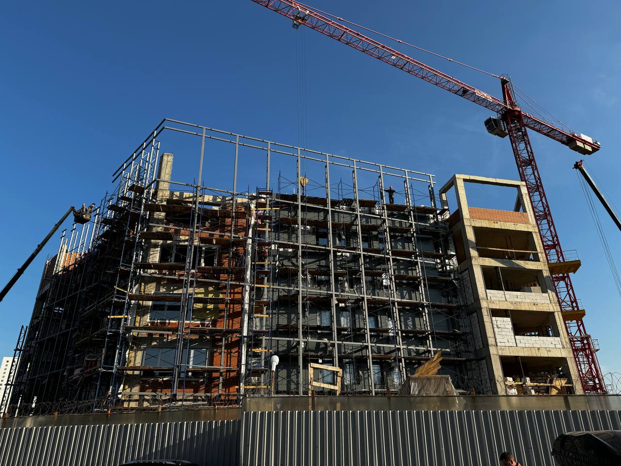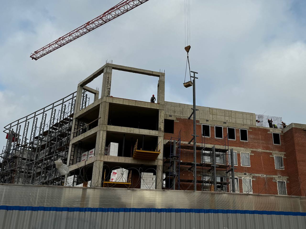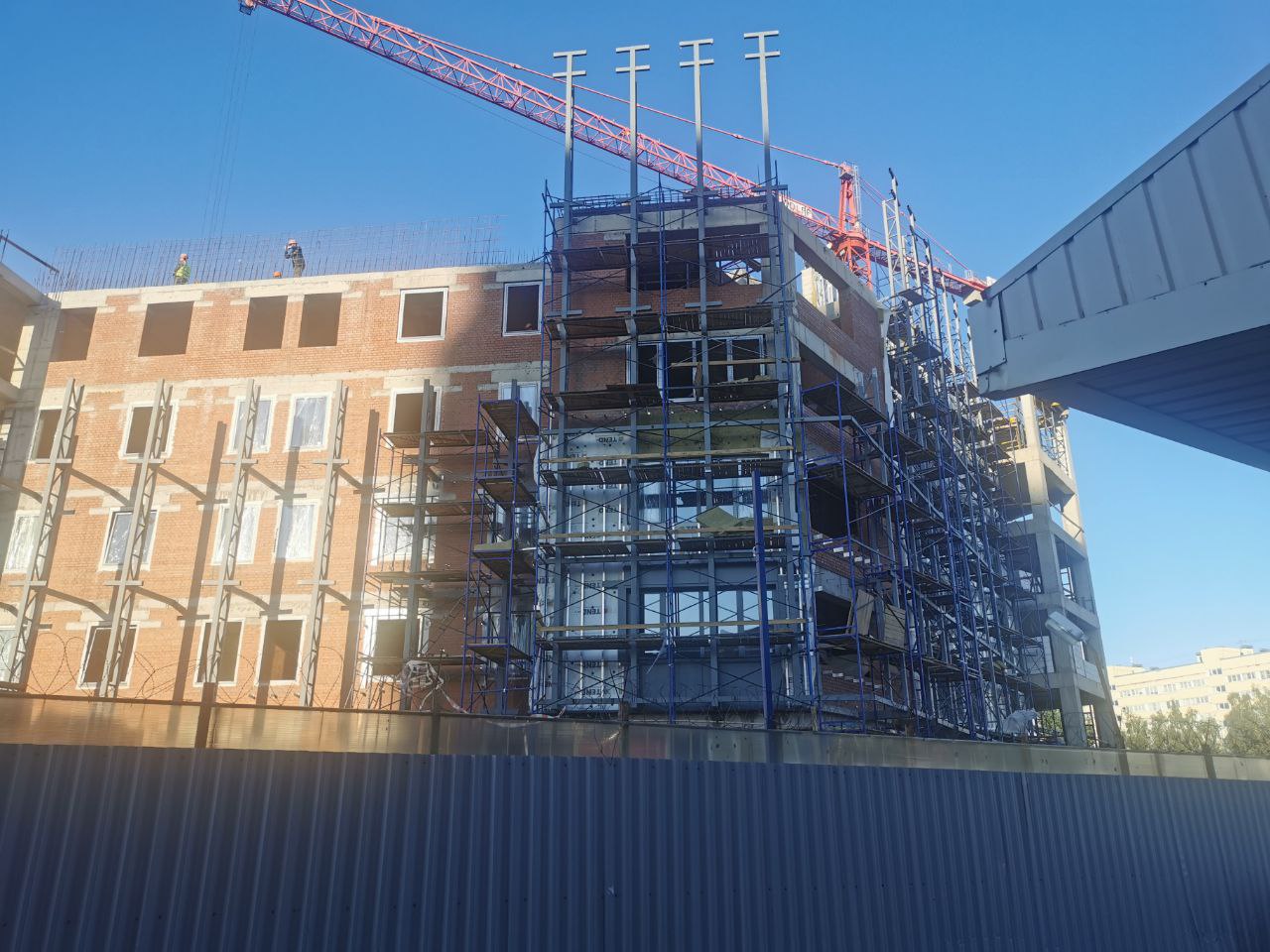 Стены здания достигли верхнего перекрытия 5 этажа, часть этого перекрытия уже забетонирована, а остающаяся часть армируется.