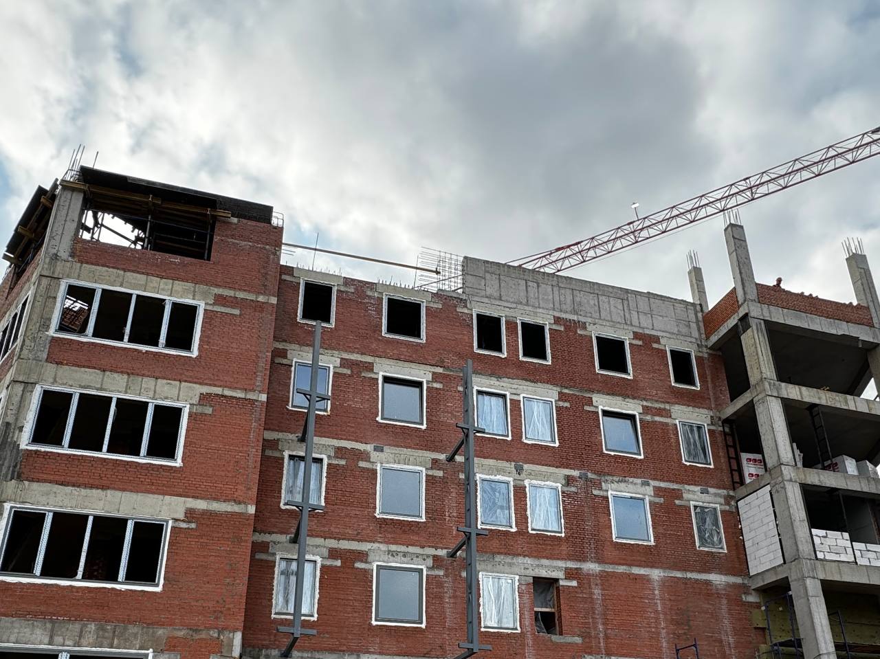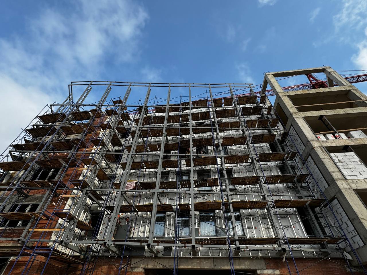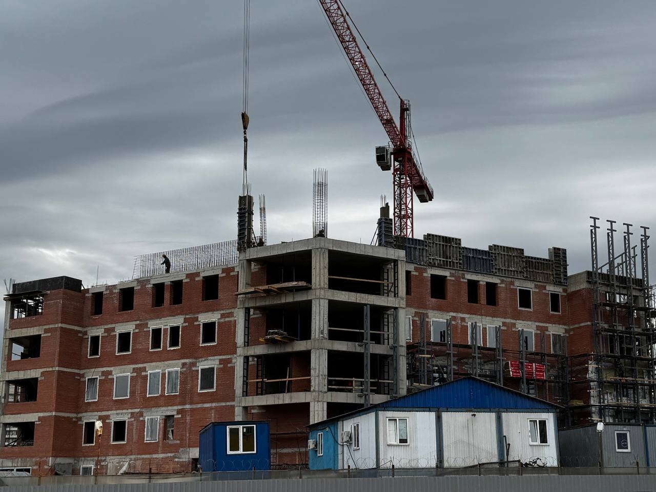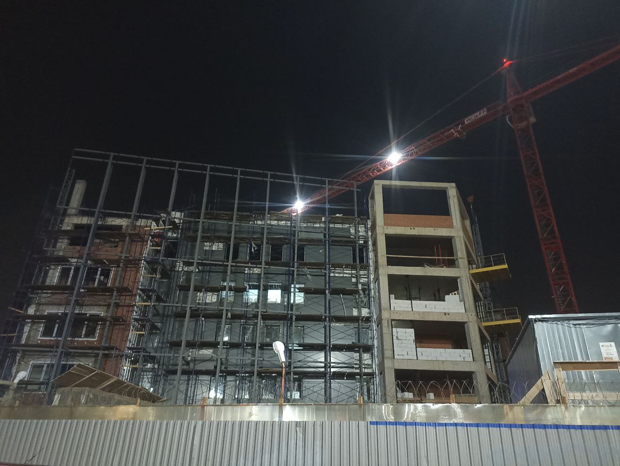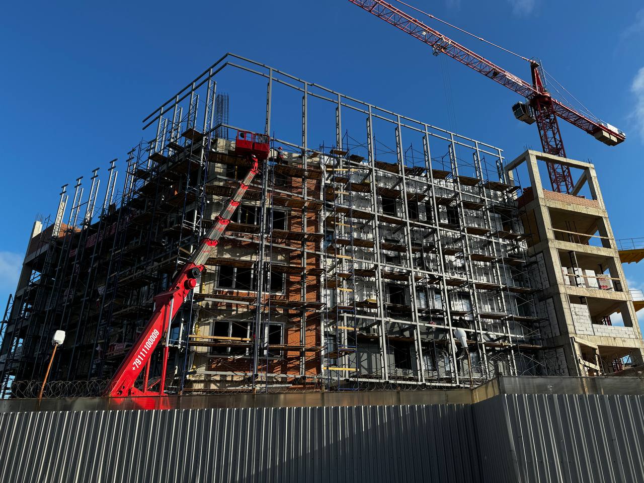 Стены здания достигли верхнего перекрытия 5 этажа, часть этого перекрытия уже забетонирована, а остающаяся часть армируется.