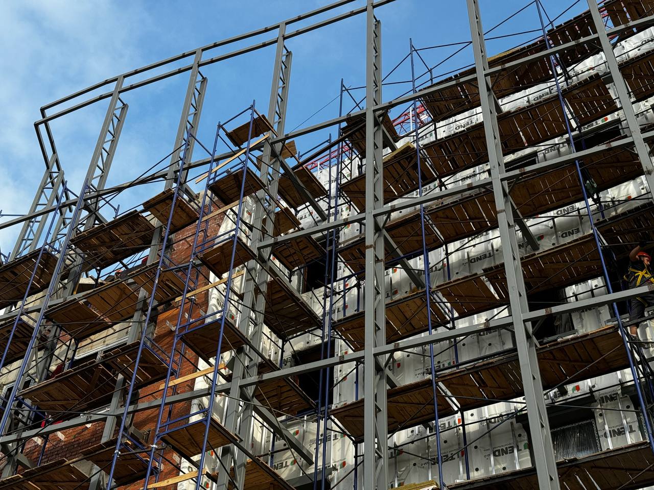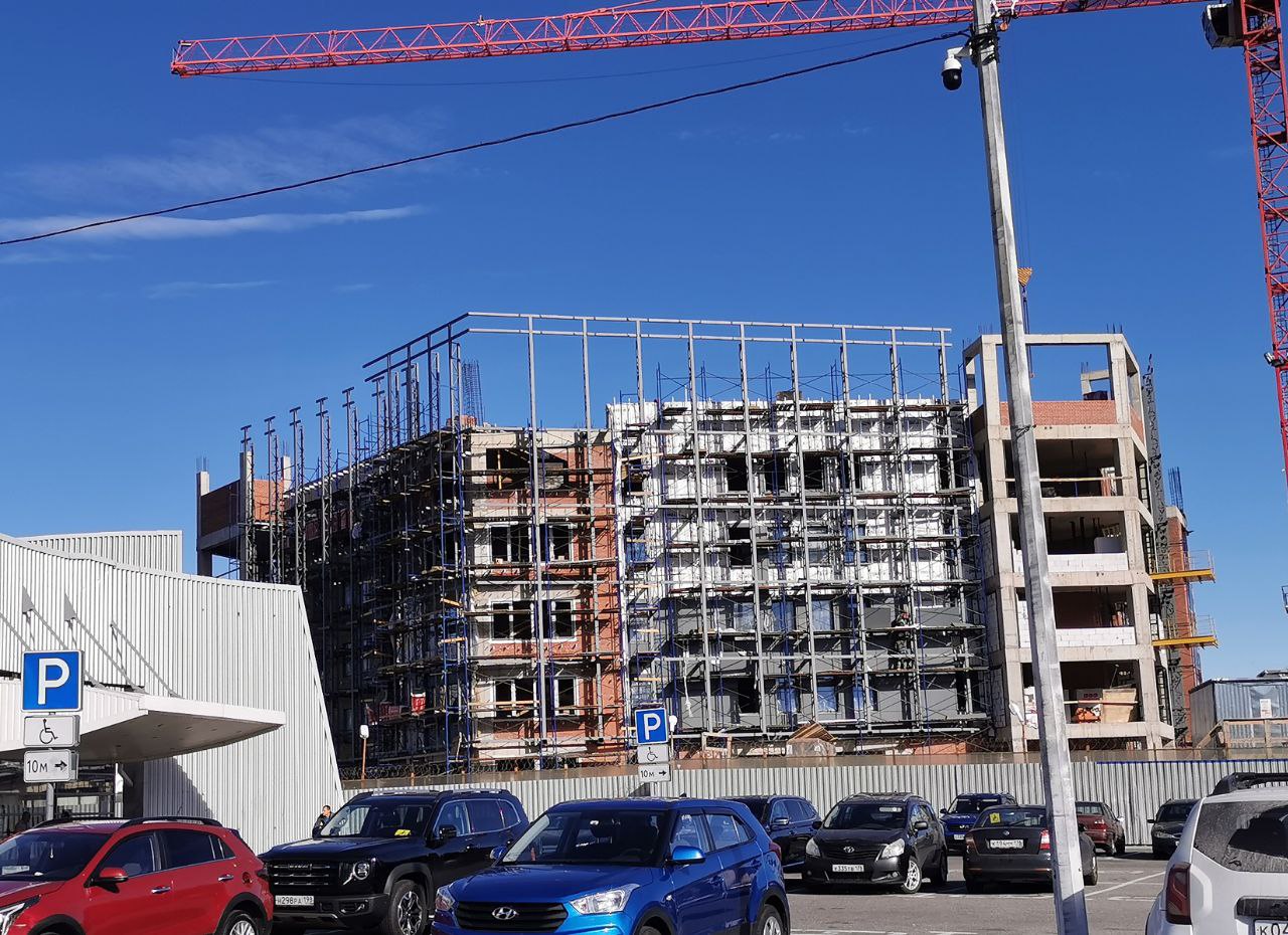 На гранях здания выходящих к проспекту Маршала Жукова со стороны гипермаркета «Окей» выполнен монтаж кронштейнов и направляющих подсистемы крепления металлических фасадных элементов, проведено утепление и смонтированы окна, продолжается монтаж каркаса для фальш-фасада.