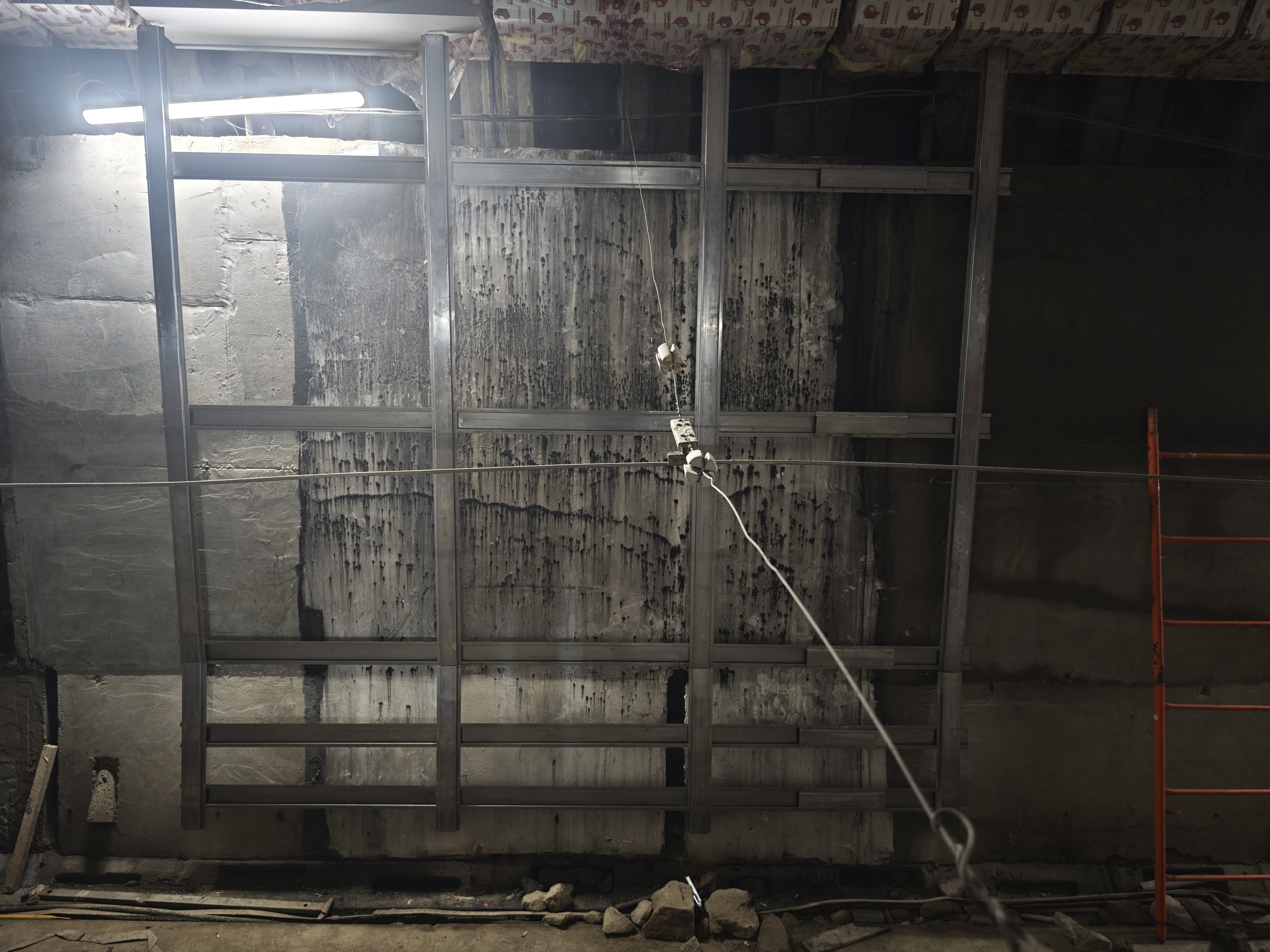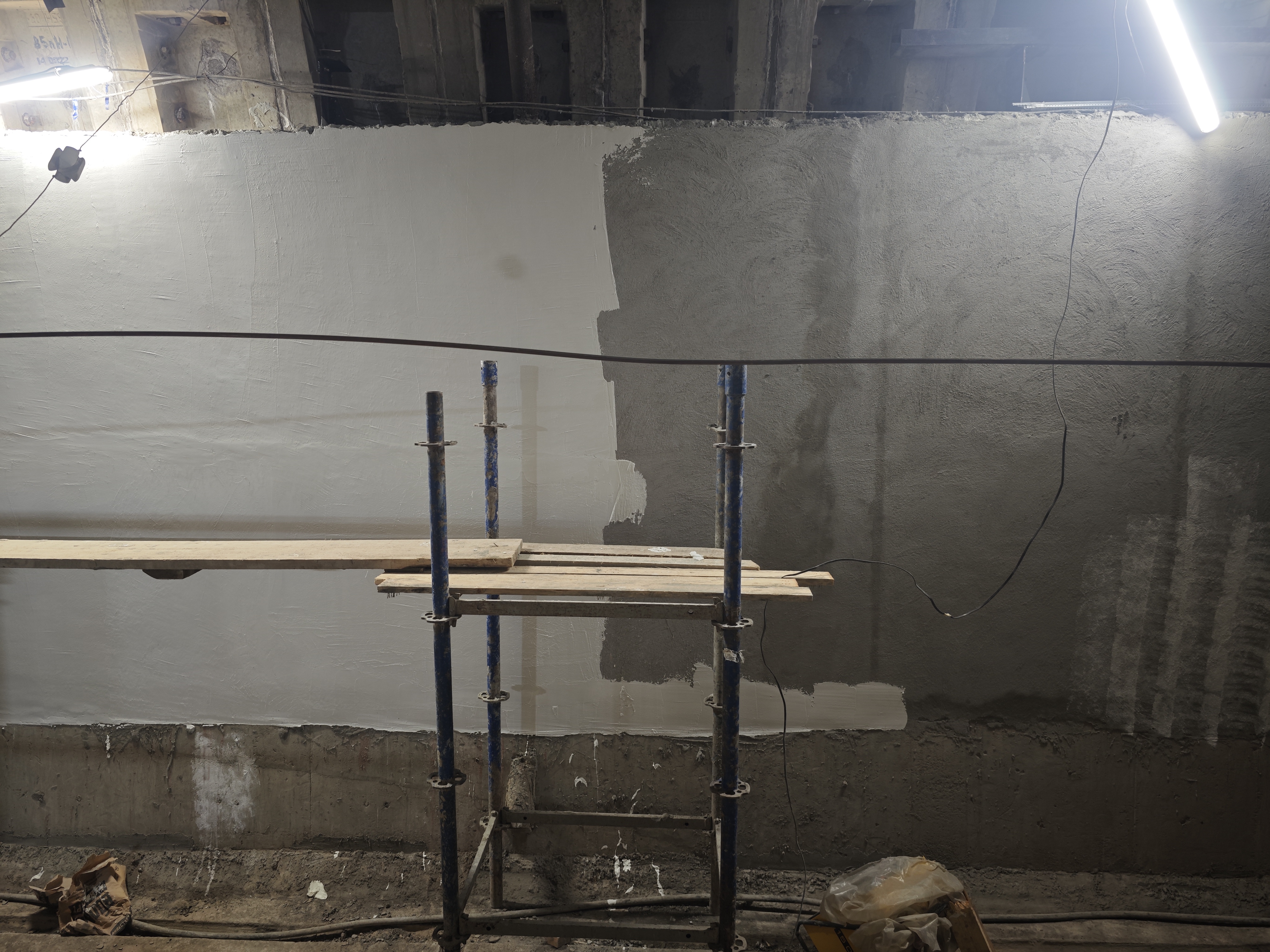 Поиск решения отделки путевой стены. В ПСТ смонтировали каркас на путевую стену, в ОСТАЛЬНОМ затукатурили, зашпаклевали и покрасили в чëрный цвет.