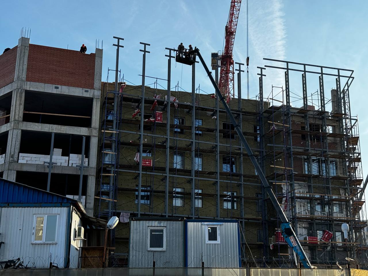 Начинается монтаж фасада на грани выходящей к пересечению проспекта Маршала Жукова и улицы Маршала Казакова.
