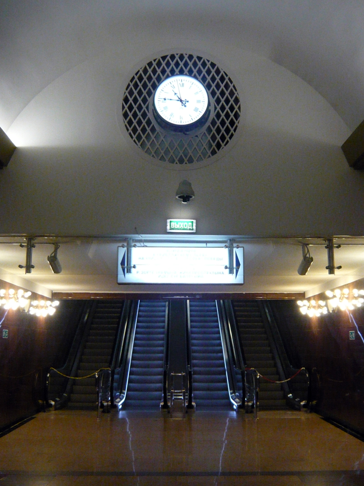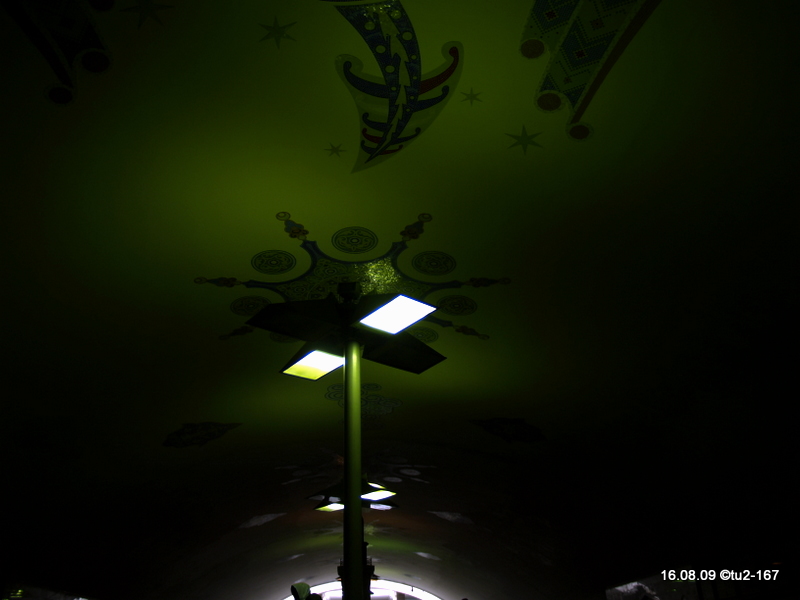 Не так уж и темно. :wink: Особенно по сравнению с «Горками». Потолок и прочая красота прекрасно видны глазами, особенно в свете фотовспышек других пассажиров, но техника — да, уже капризничает.