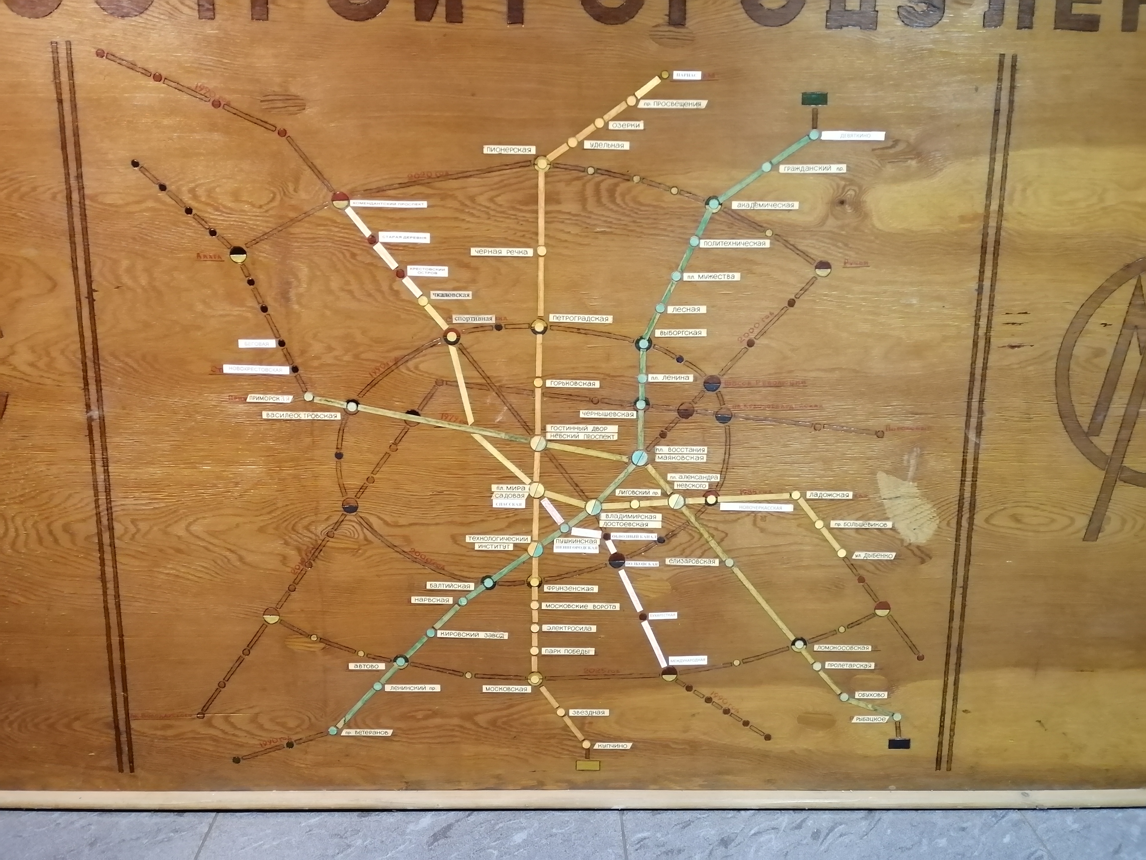 б) часть из них, отличного от оригинала цвета и шрифта, приклеили позднее в процессе «актуализации» схемы. Судя по разнице оттенков кусочков слева и справа от Садовой, делать это начали где-то в промежутке 1992-1995