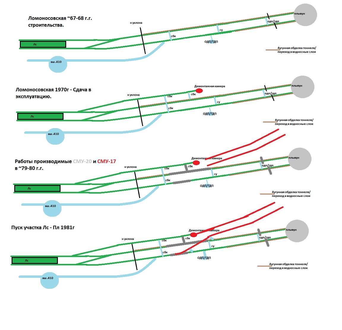 Я тоже заметил неточность в схеме по типам обделок. Участки тупиков в районе забутовок сооружены в ж/б обделке диаметром 5,5 метров, а участки, попадающие в водоносные грунты - в чугунной обделке. Причём, первый путь - в обделке диаметром 6.0м, а третий - в обделке диаметром 5.49м. У них есть отличие.