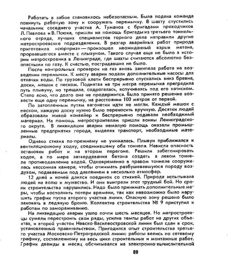 Все сомнения разрешились уже во время строительства линии, которое проходило в атмосфере «полной новых тревог, напряженного труда и деятельных поисков». Когда активно сооружались перегонные тоннели в районе станции «Ломоносовская», неожиданный «сюрприз» метростроевцам преподнесла сама природа. Внезапно произошёл взрыв метана, который прорвался в шахту вместе с плывуном, грозившим затопить строившийся участок. Эту опасную зону решено было «заковать в ледяную броню».