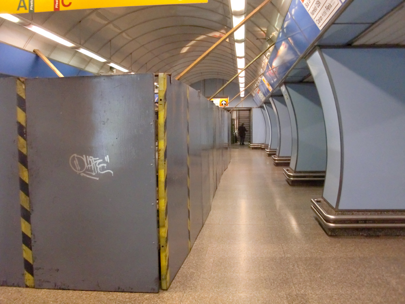Платформа станции, где идёт ремонт эскалатора.