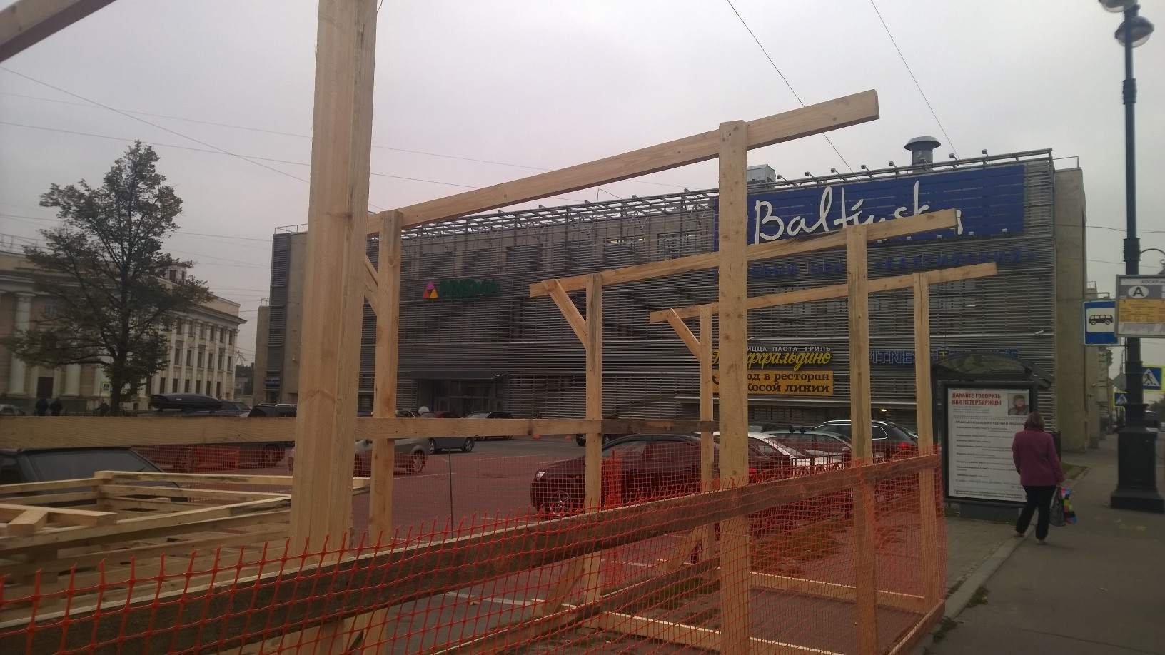Довольно большой заброшенный участок (когда-то он планировался под парковку) расчищен от деревьев и огорожен синим забором .
