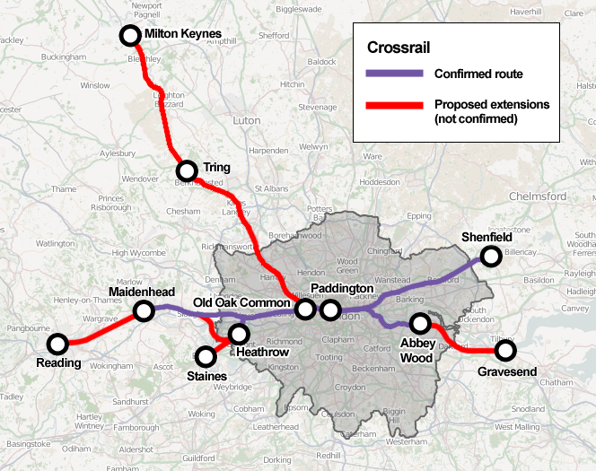 Планируется, что новый вид общественного транспорта Лондона свяжет городские районы, а также восточные и западные пригороды. Протяжённость линий составит 118 км. Пропускная способность расcчитана на 24 поезда из 10 вагонов в час в каждом направлении, максимальная скорость на наземных участках — до 160 км/ч, в тоннелях — до 100 км/ч. Под центром города железная дорога пройдёт под землёй. Введение в эксплуатацию запланировано на 2018 год. В 2008 году парламент Великобритании принял акт о строительстве Crossrail. Общая стоимость проекта оценивается в 15,9 млрд фунтов стерлингов, из которых 5,6 млрд составят средства из государственной казны, 7,7 млрд — из средств городской транспортной компании Лондона Transport for London и 2,6 млрд — частные инвестиции.