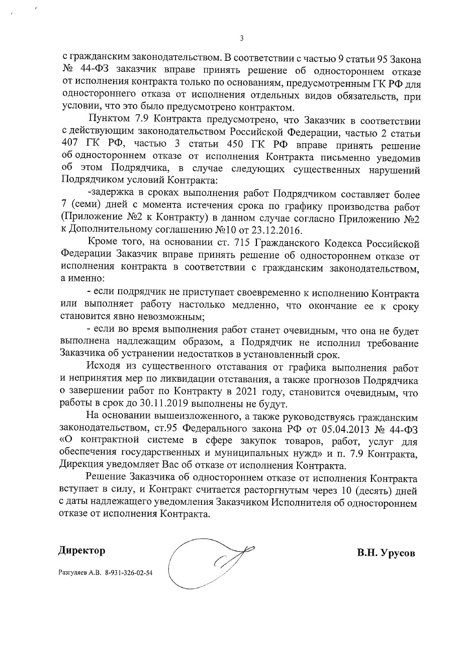 А вот и официальный документ о расторжении государственного контракта на строительство участка ст.Спасская - ст. Большой пр. Подписан 21 января 2019 г., вступает в силу через 10 дней с даты уведомления Исполнителя контракта.