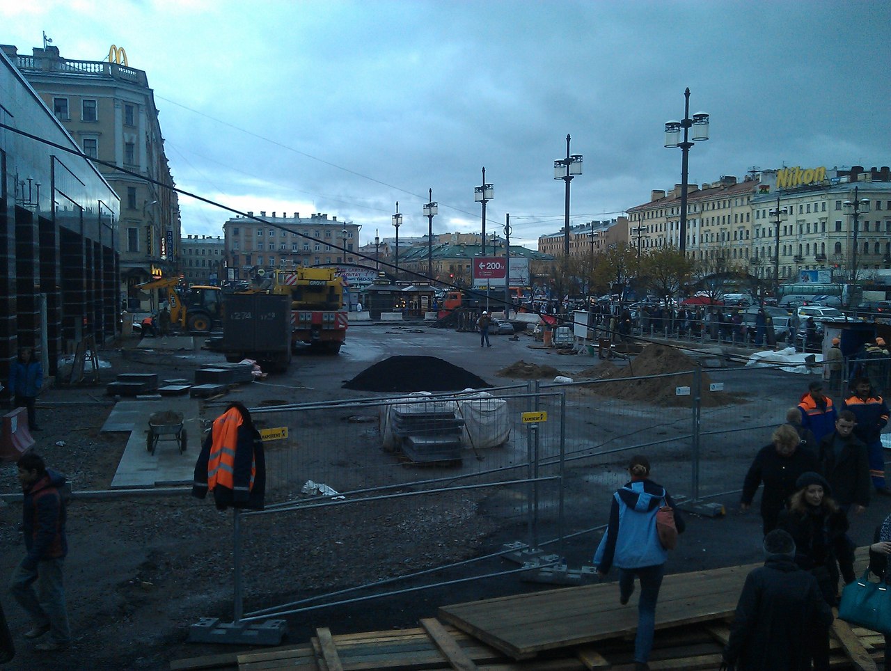 За выходные очень сильно продвинулись в плане благоустройства территории. Следов недавней стройплощадки остается все меньше и меньше. Разобрали зачем-то брусчатку (кирпичи) оставшуюся у вестибюля "Сенной площади", настелили досчатый настил, и средь бела дня укладывают вкривь и вкось нижний слой асфальта. Видать решили унифицировать покрытие тротуаров у обоих вестибюлей, хотя старая брусчатка никому бы не мешала бы до начала активной реконструкции самой площади. Свежая фотография: