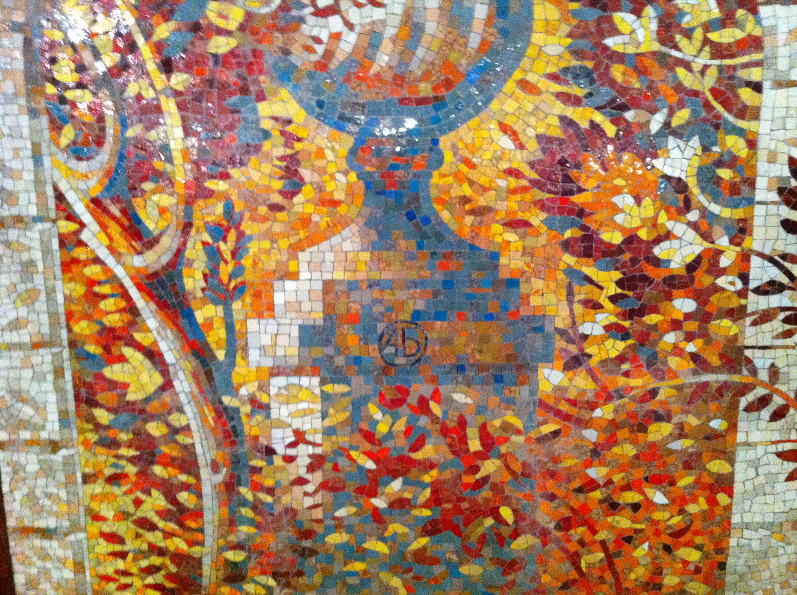 Жёлтая мозаичная полоса и ступенчатые пилоны - хорошие "фишки" станции. :-)