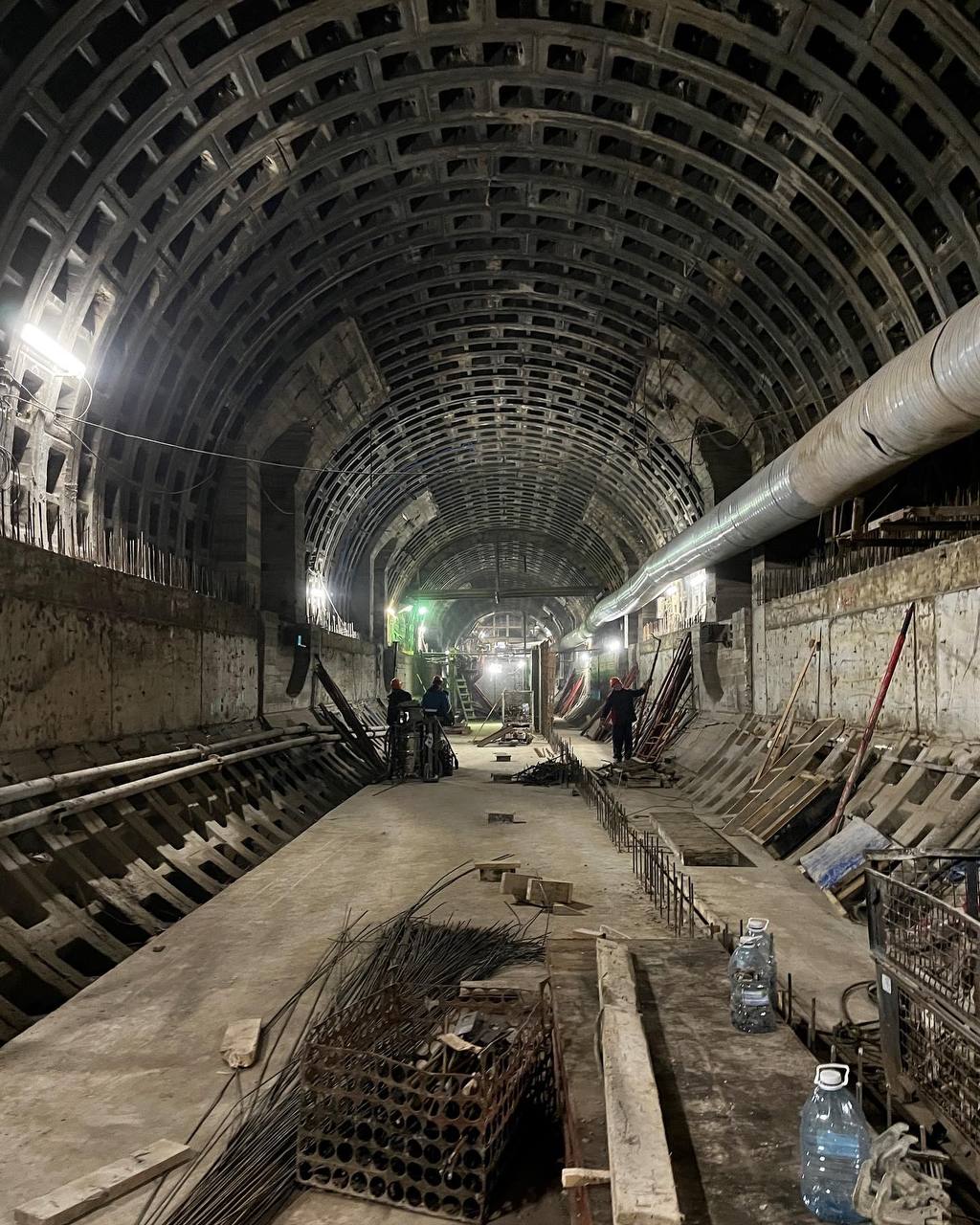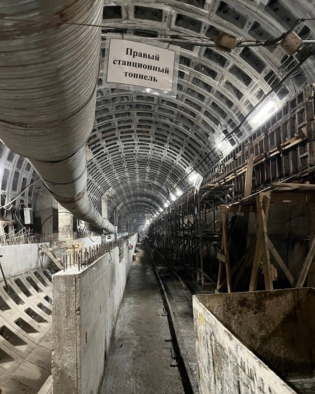 Боковой станционный тоннель по 2 пути (сюда будут прибывать поезда из центра). Сооружена подпорная стена платформы, а также основание путевой стены, залито жесткое основание, на котором в последующем будет заливаться путевой бетон.