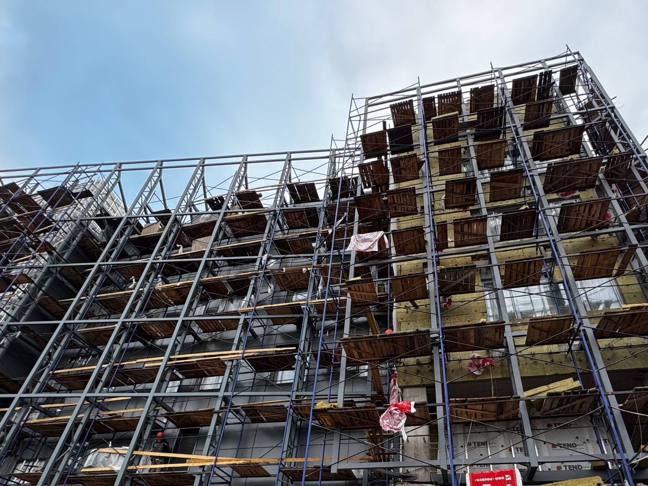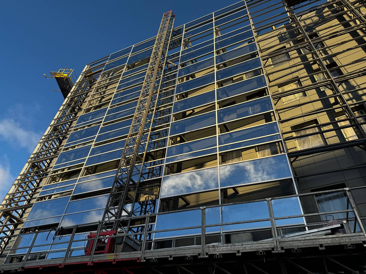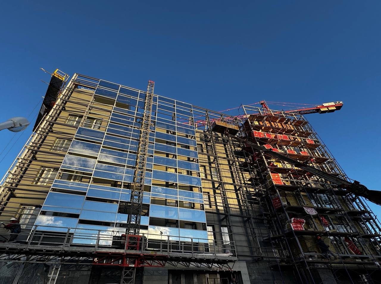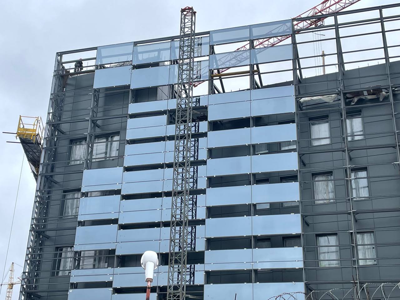 Смонтированы первые стеклянные панели фальш-фасада.