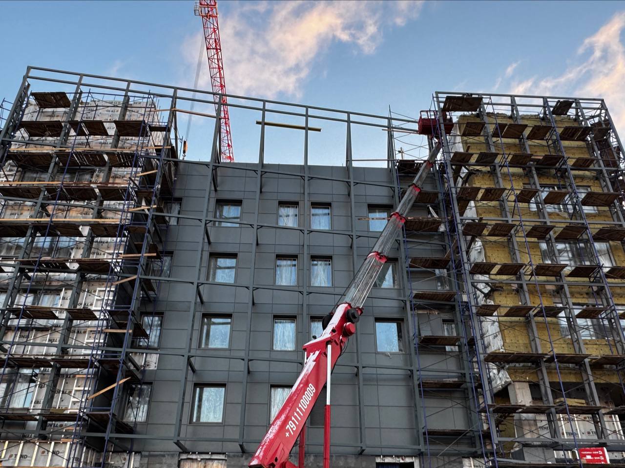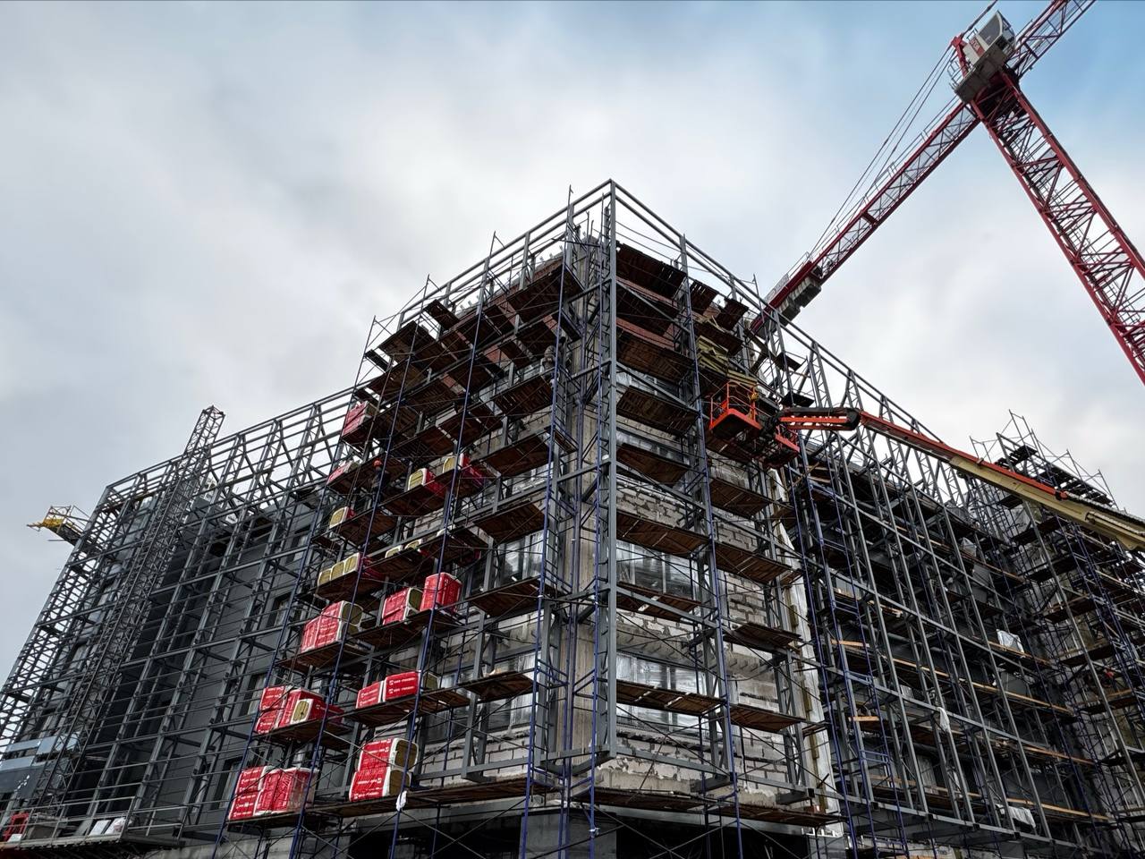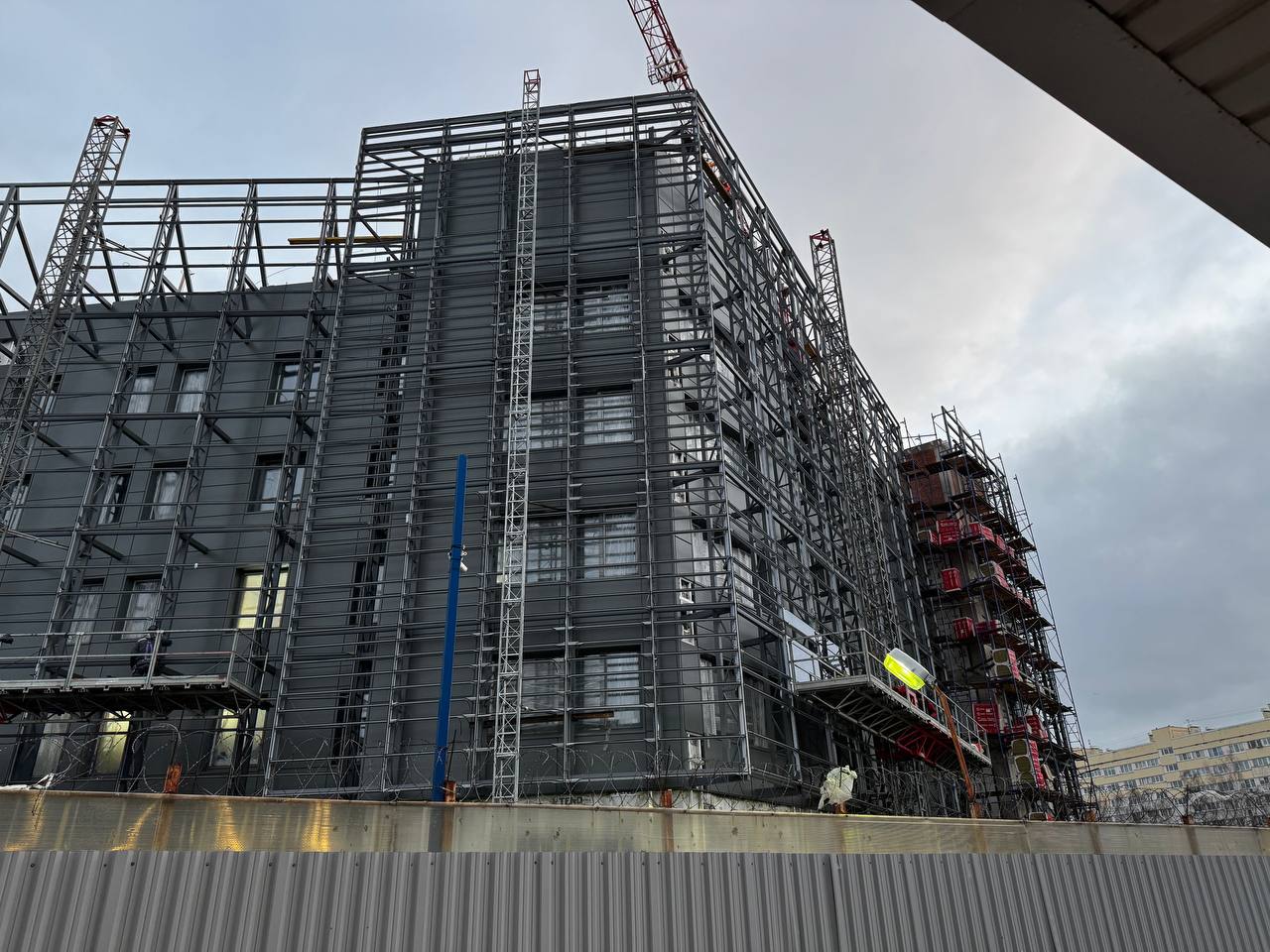 Смонтированы первые стеклянные панели фальш-фасада.