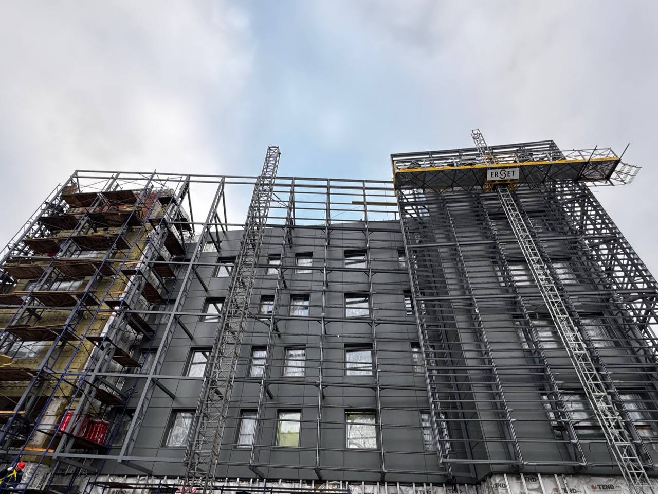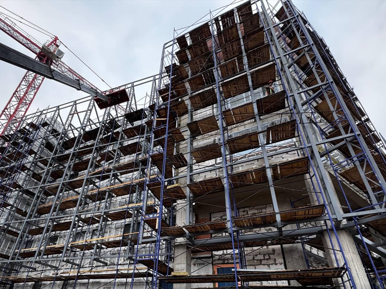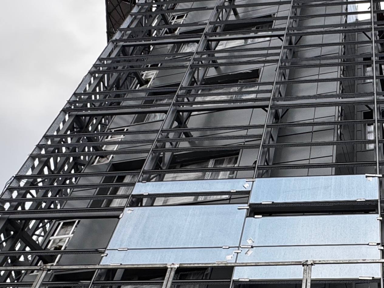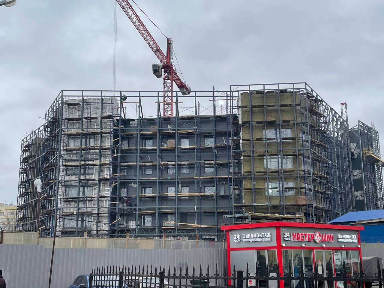 Смонтированы первые стеклянные панели фальш-фасада.