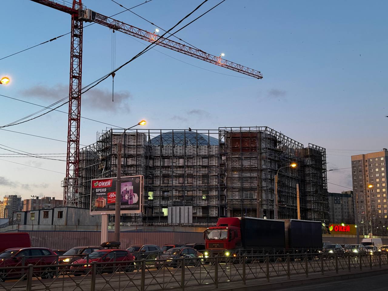 Одна из граней фальш-фасада вестибюля станции «Юго-Западная» строительства Красносельско-Калининской линии Петербургского метрополитена выглядит почти готовой.