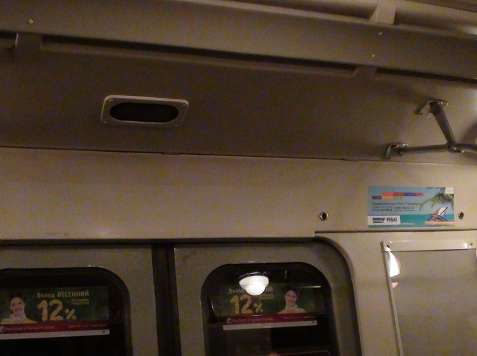 Это единственное исключение, как и сам вагон. Салон в нём отличается. Салон-комплект (пластик) чуть тёмнее, чем в "серийных" Автокомпозитах на КВЛ. Динамики там расположены снаружи, над дверьми в шахматном порядке.