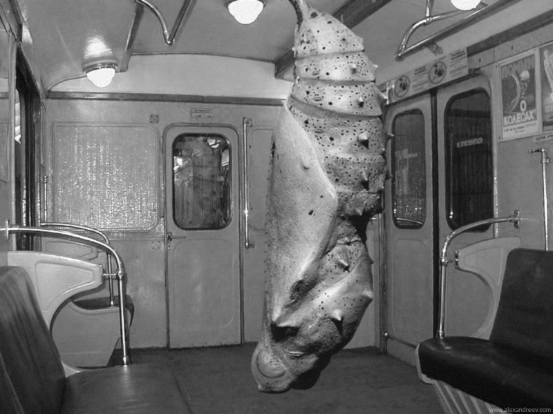 А.Андреев только перевёл его в ч/б, выровнял завал горизонта, добавил это существо и (!) заменил два рекламных плаката. Всё остальное совпадает, вплоть до бликов на сиденьях и рекламы, просвечивающей через правые двери. Забавно.