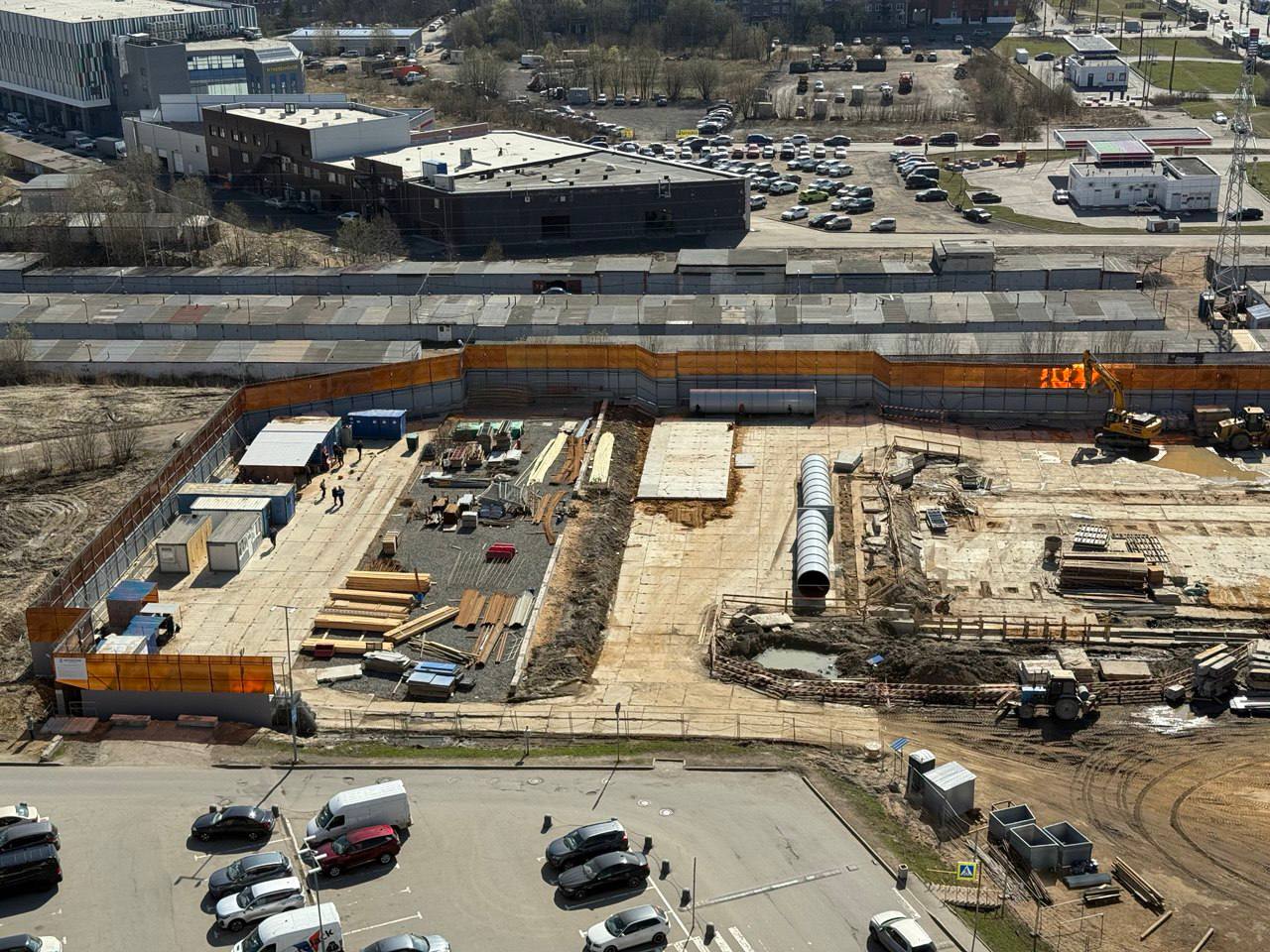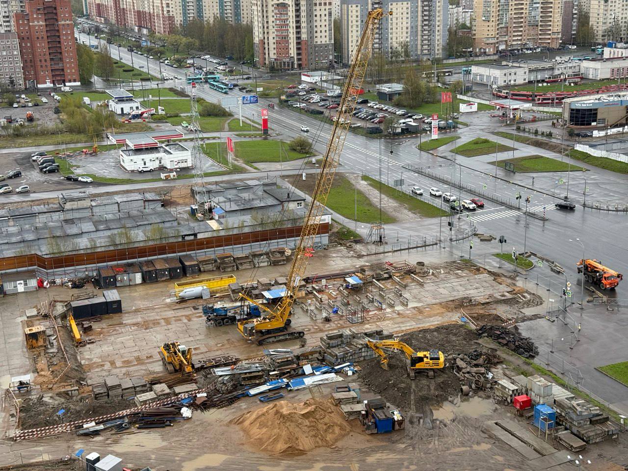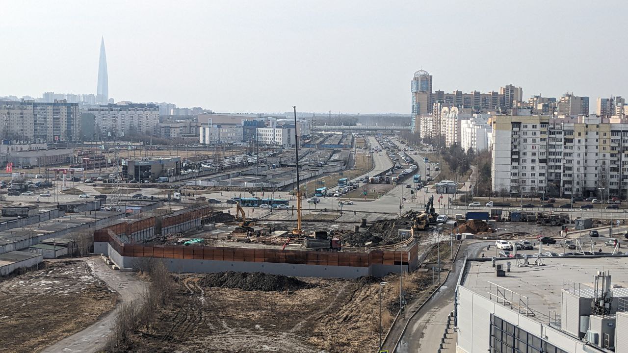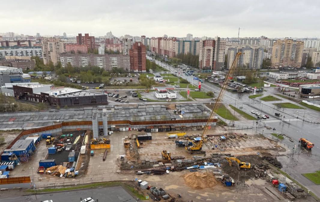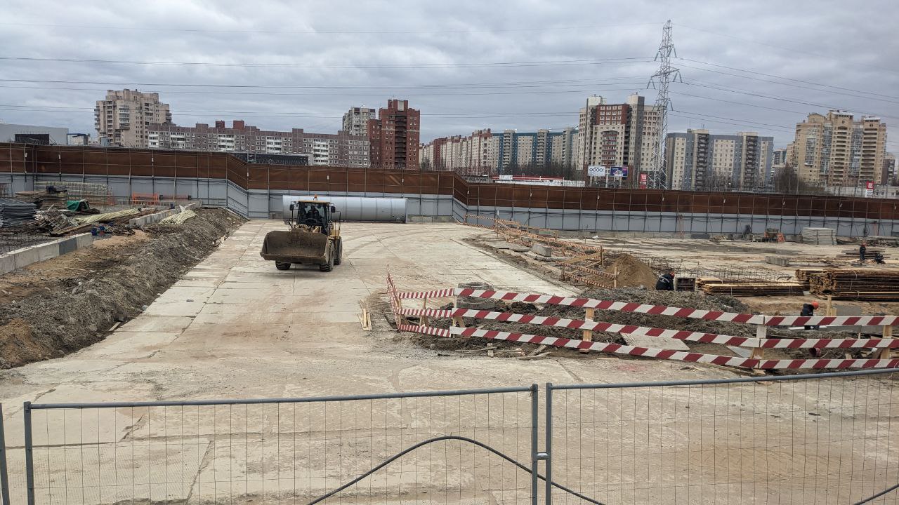 Сейчас западная часть строительной площадки находится на уровне Шуваловского проспекта, продолжение которого расположится прям над новой станцией метро.