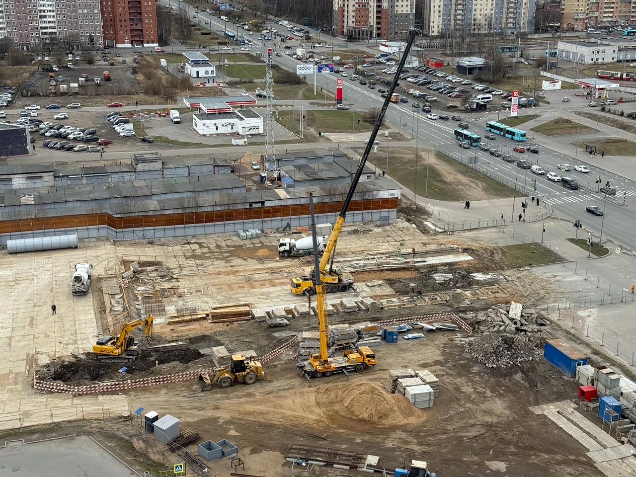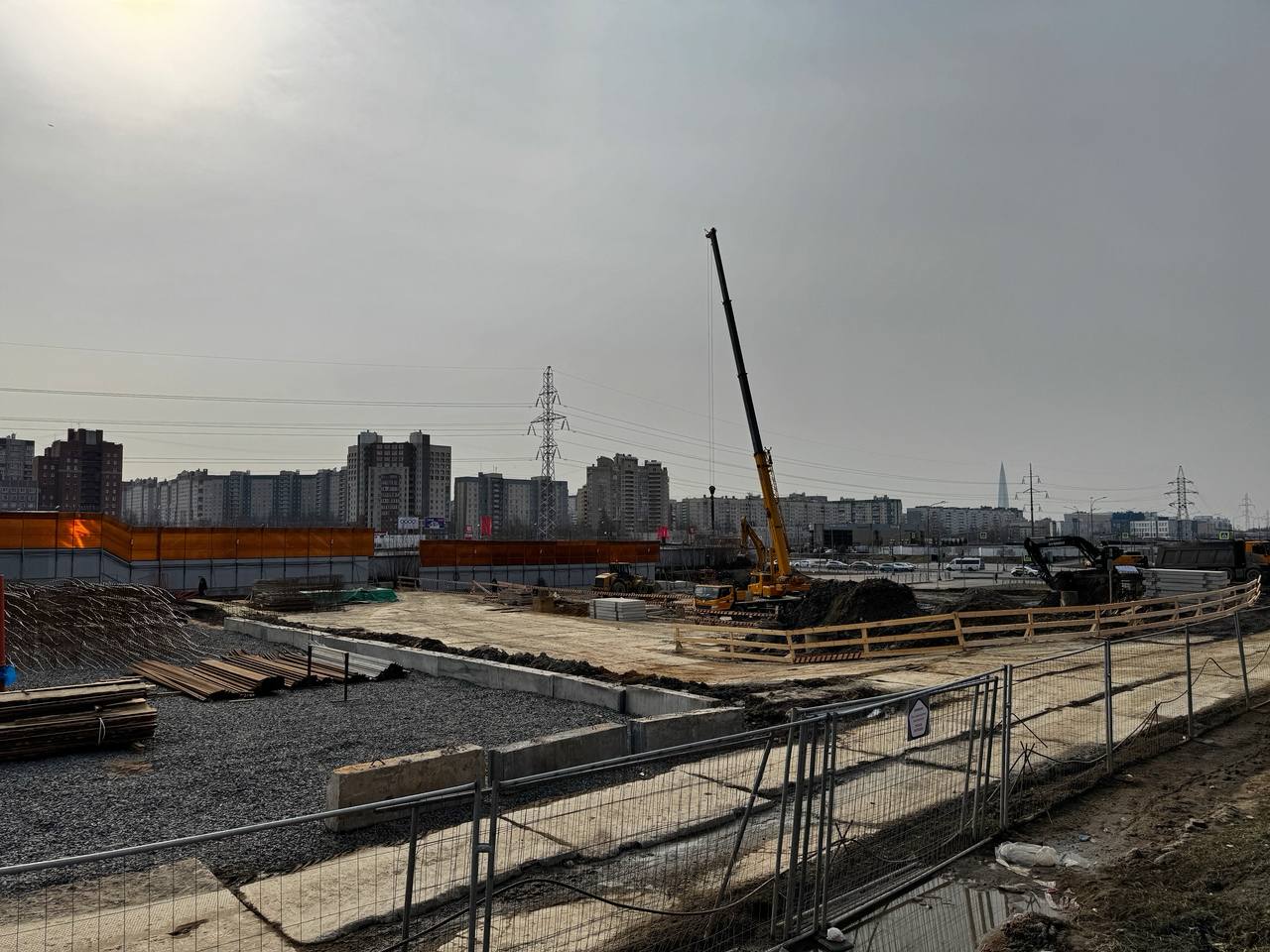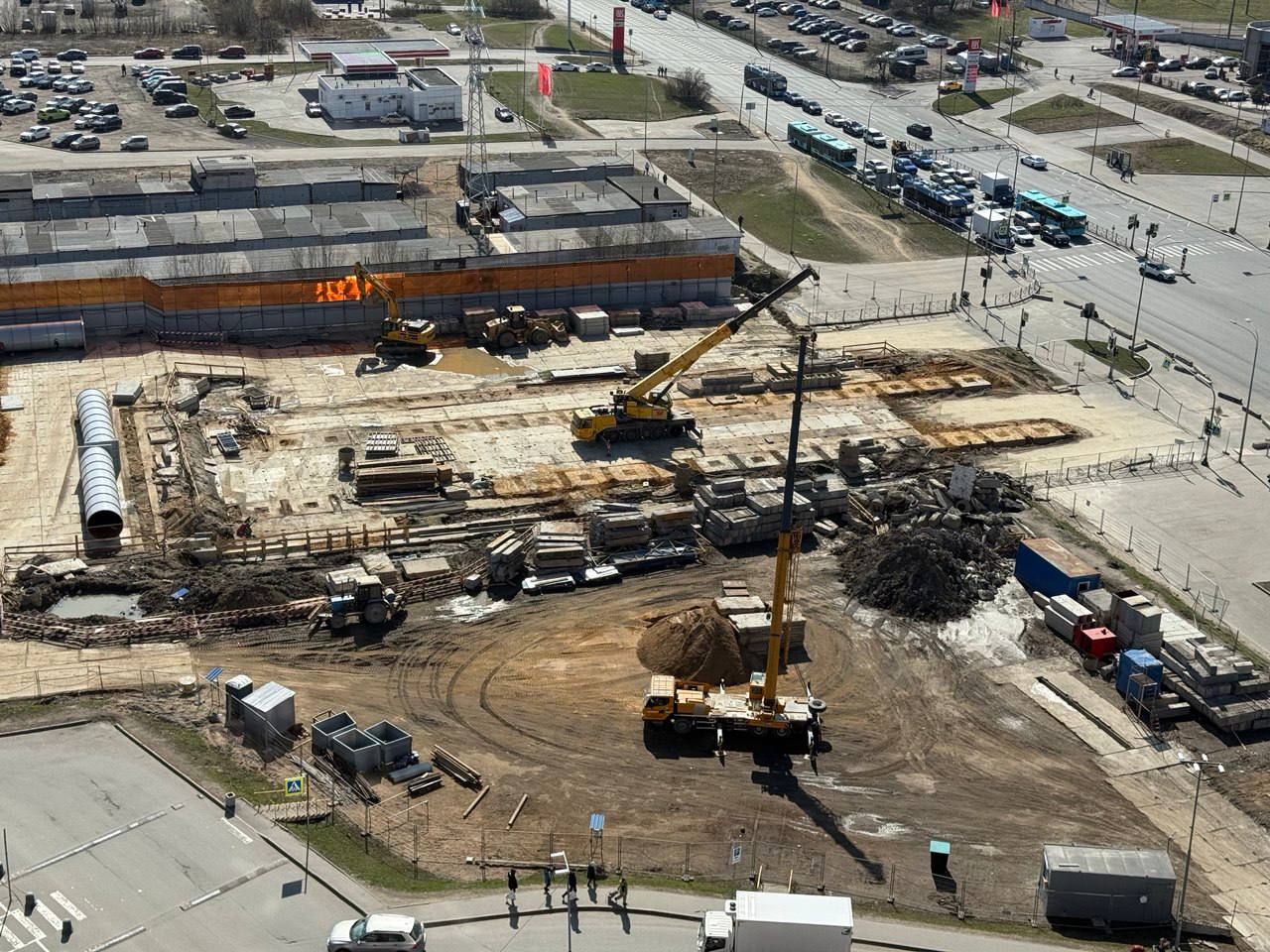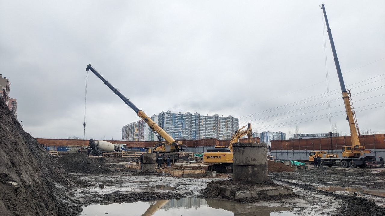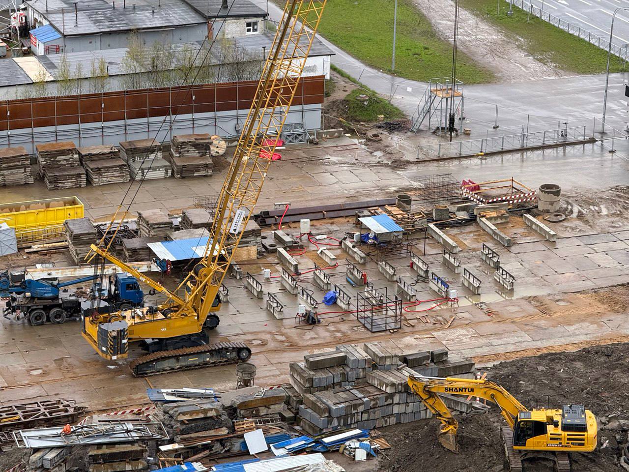 Сейчас западная часть строительной площадки находится на уровне Шуваловского проспекта, продолжение которого расположится прям над новой станцией метро.