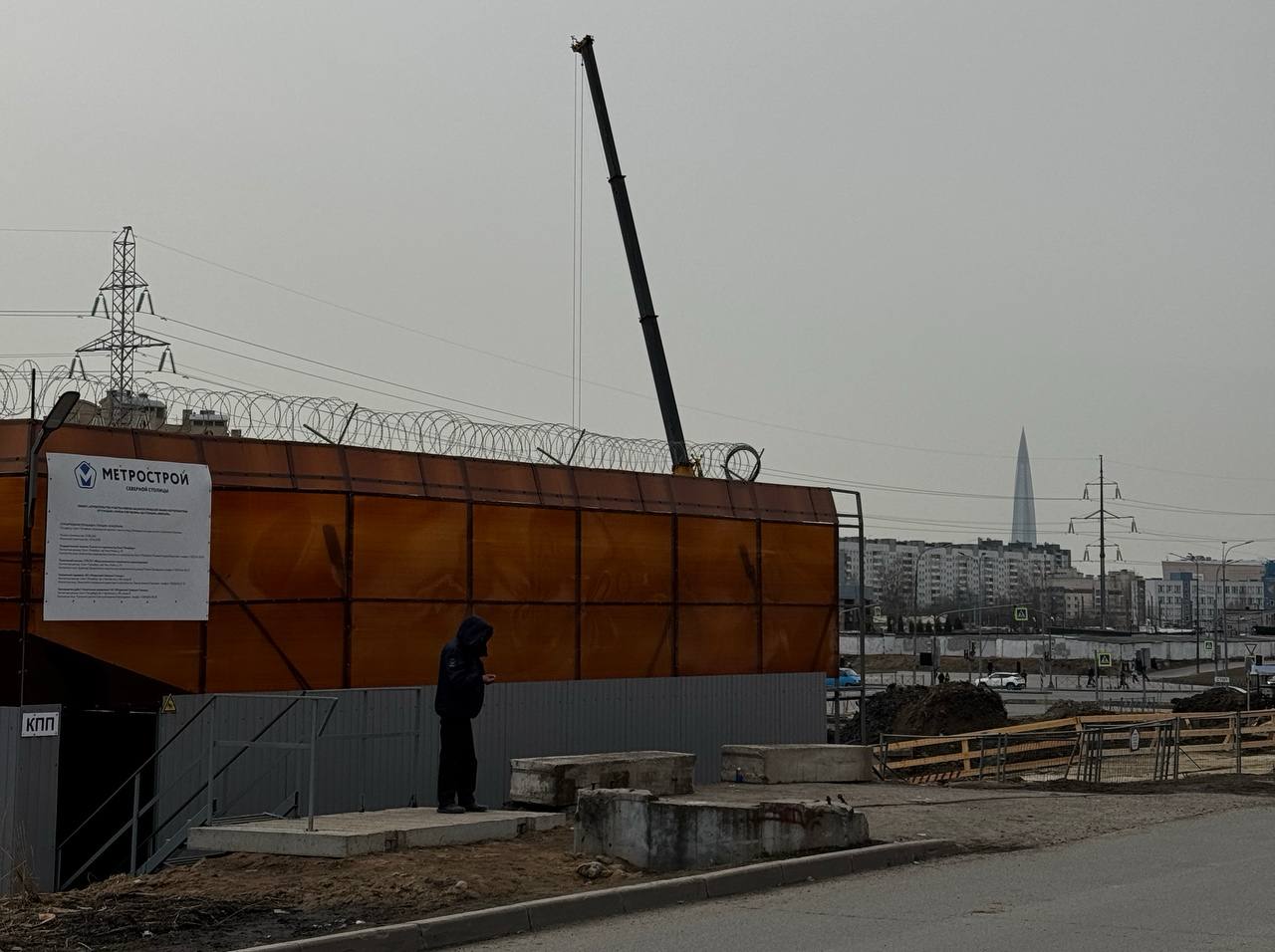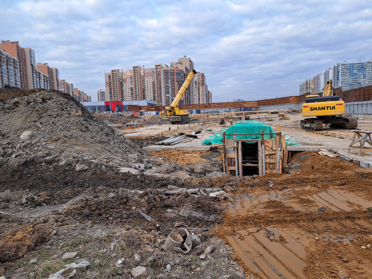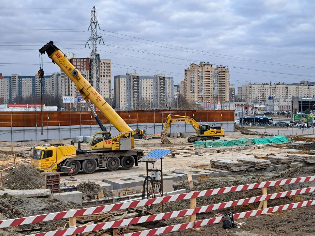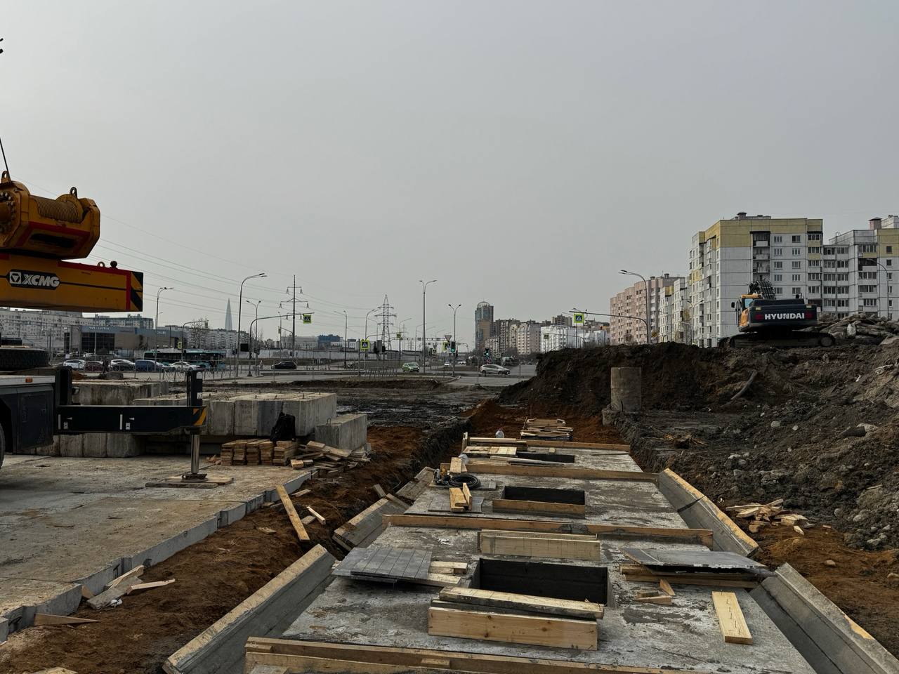 Сейчас западная часть строительной площадки находится на уровне Шуваловского проспекта, продолжение которого расположится прям над новой станцией метро.