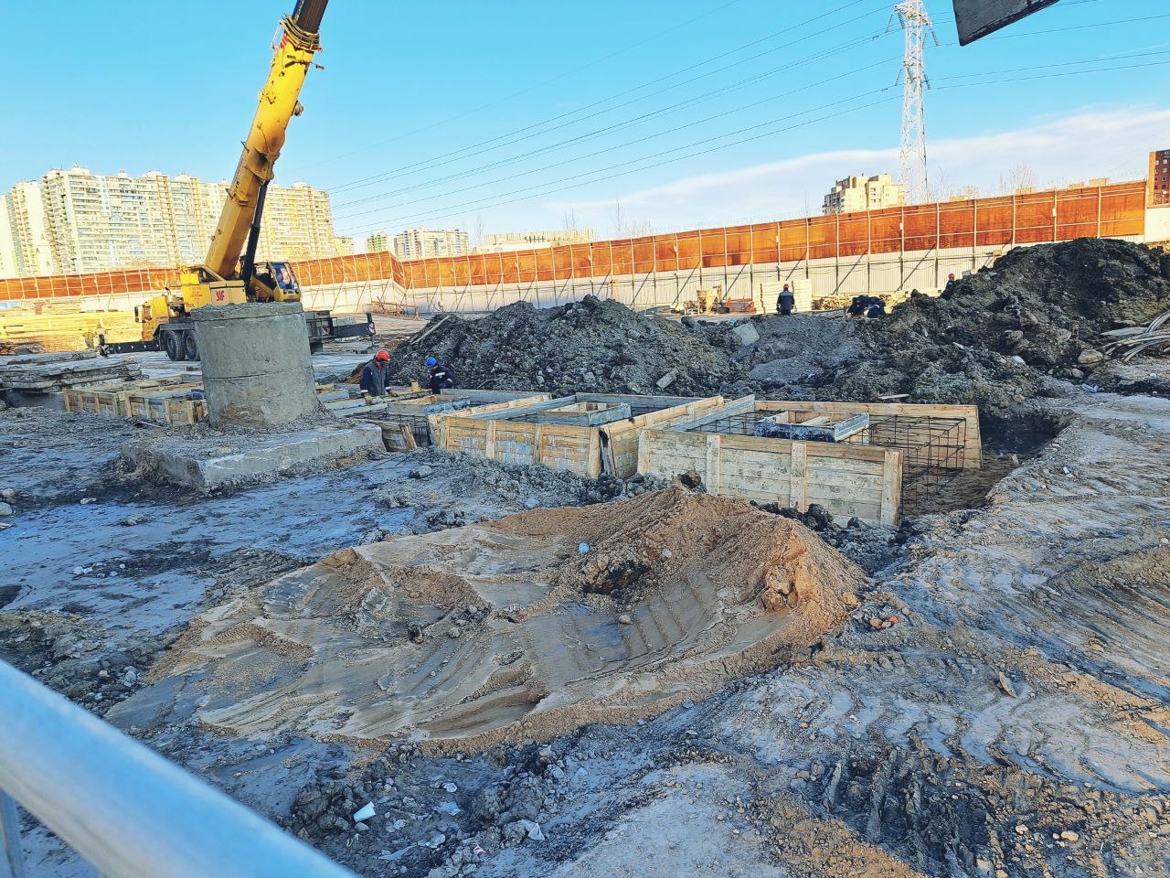 Продолжается сооружение форшахты для будущей стены в грунте (фото 2 и 4), а также форшахт для временных распорных колон (квадраты на 3 фото), которые необходимы для устройства вестибюля.