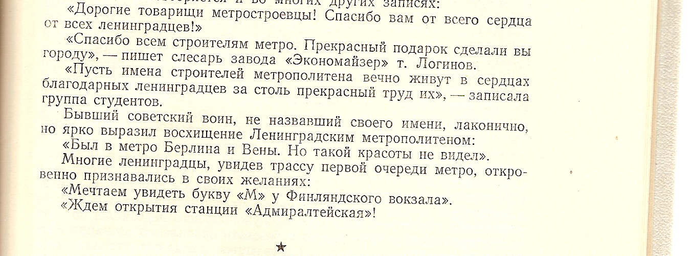 Думаю, это можно отнести к этому разделу. Отрывок из книги "Ленинградский метрополитен имени В.И. Ленина" 1956 года. Записи из книг отзывов. Последняя мне почему-то очень понравилась