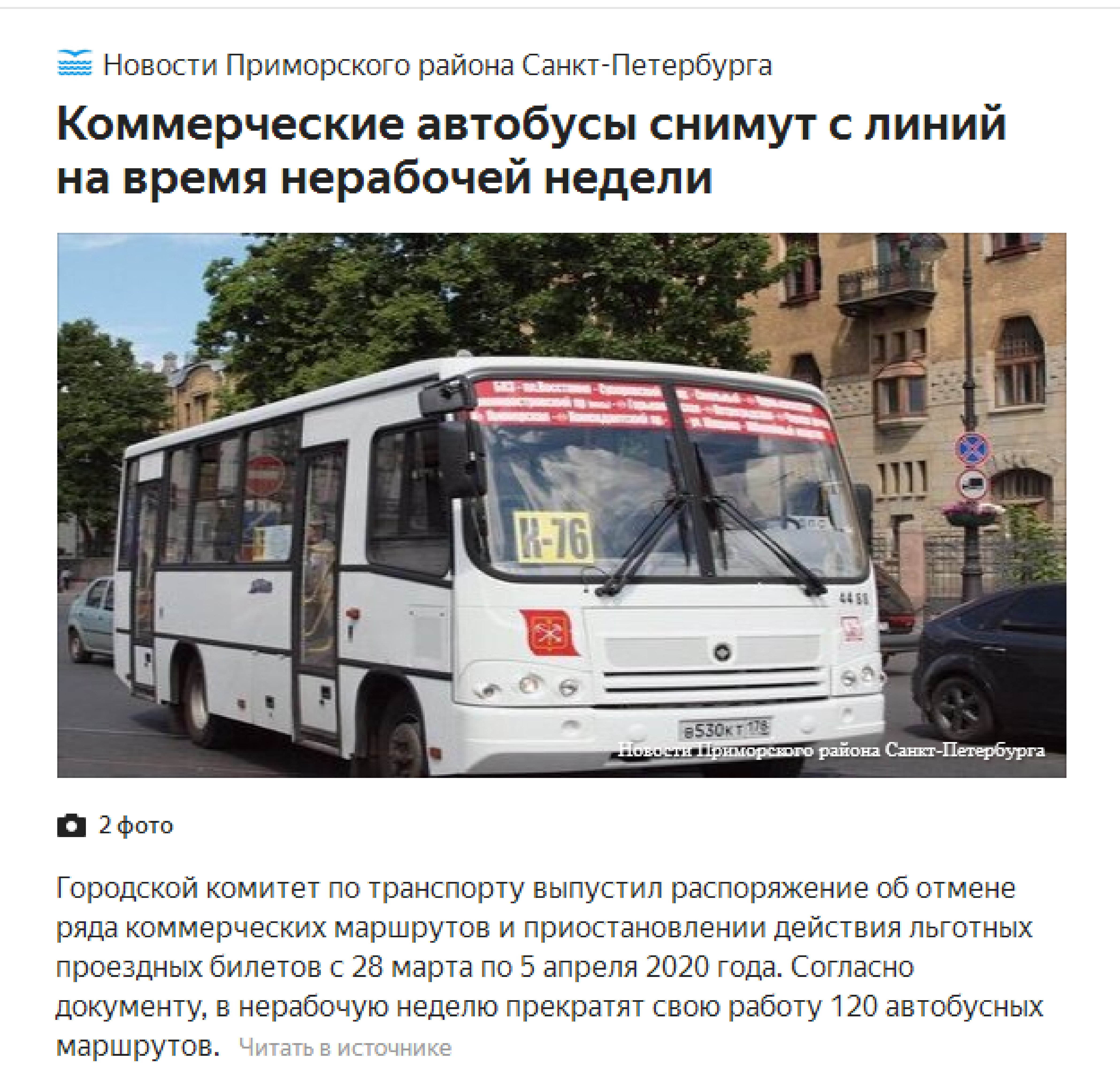 Комитет по транспорту Петербурга 25 марта утвердил список из 120 коммерческих автобусных маршрутов, приостанавливающих работу с 28 марта по 5 апреля 2020 года. Это маршруты, трассы которых дублируются иными видами транспорта, а также маршруты, следующие к торговым центрам. Всего в городе 720 маршрутов общественного транспорта.