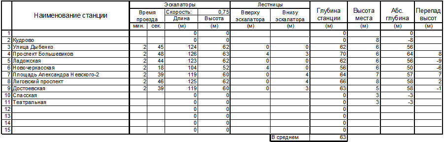 Ваши данные очень близки к моим оценкам глубин (по балюстрадам). Единственное систематическое отличие относится к станциям с наиболее длинными эскалаторами. По моим подсчетам, многие станции: Площадь Мужества, Политехническая, Академическая, Черная Речка, Пионерская, Удельная, Озерки, Ладожская, Обухово и т.д. - имеют эскалаторы одинаковой высоты - 65 метров. Впрочем, расхождение данных может быть связано с погрешностью измерений. Да и временная шкала чуть-чуть, но не совсем пропорциональна высотной - из-за скруглений эскалаторов на концах.