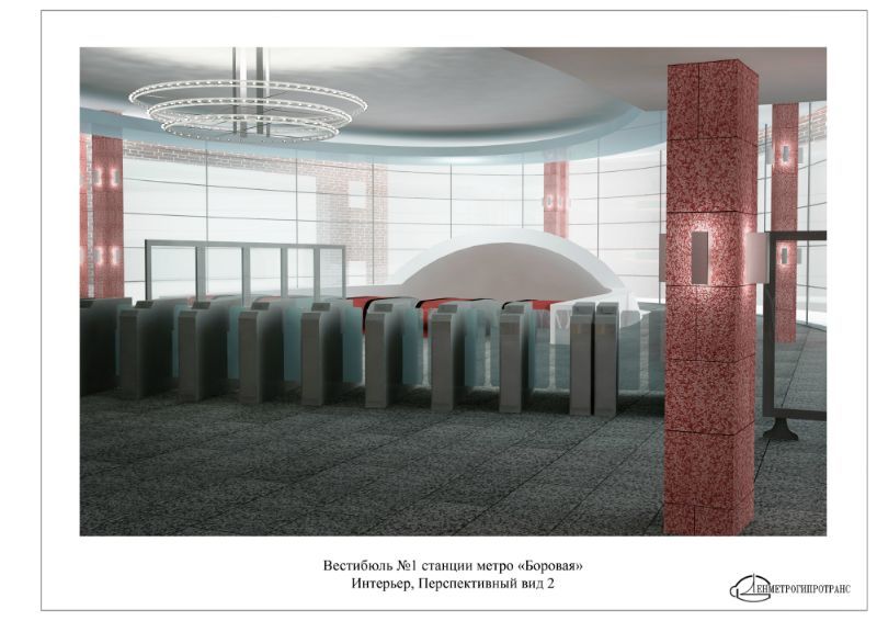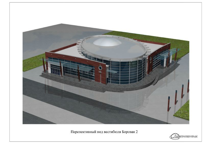 Следующая станция – «Боровая». По проекту, у нее будет два выхода и отдельно стоящих вестибюля. Так, вестибюль «Боровая-1» возведут рядом с одноименной железнодорожной станцией Витебского направления, «Боровая-2» – на пересечении Лиговского проспекта и улиц Тосина. Учитывая, что это место не имеет особых достопримечательностей, в «Ленметрогипротрансе» просто решили выполнить архитектуру станции в современном стиле, без какой-либо четкой тематической привязки.