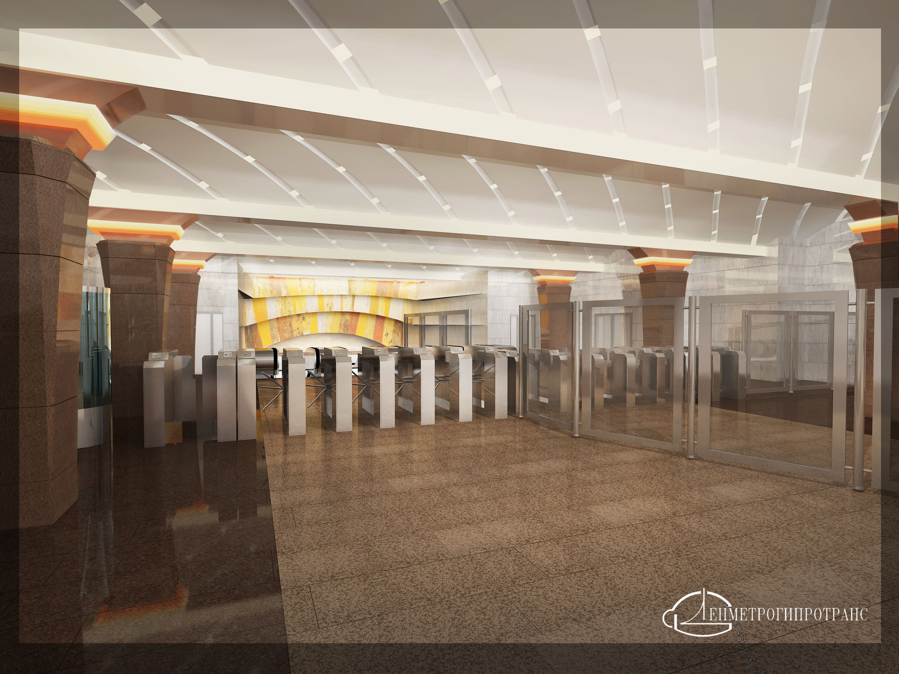 Тематика литейного дела будет использоваться и в оформлении интерьеров станции. Так, капители колонн в наземном вестибюле будут облицованы желто-оранжевыми материалами, словно металл, который только что вытащили из раскаленной печи. В этих же цветах будет оформлена и стена вестибюля над входом на эскалаторы.
