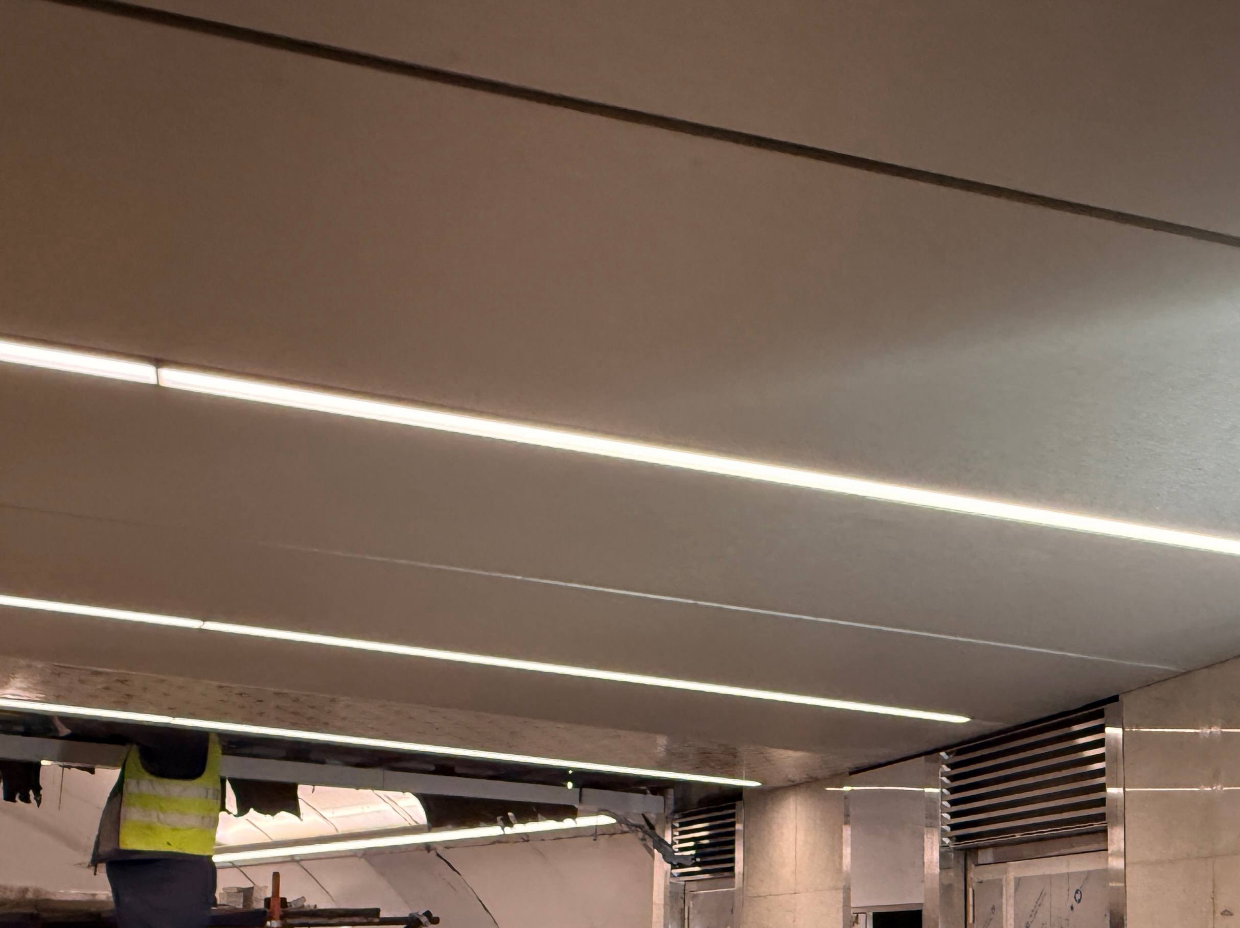 В вестибюле Путиловской завершили монтаж потолка (так называемой «кубота») под антаблементом здания, завершают монтаж куботы и установку освещения в служебной части вестибюля.