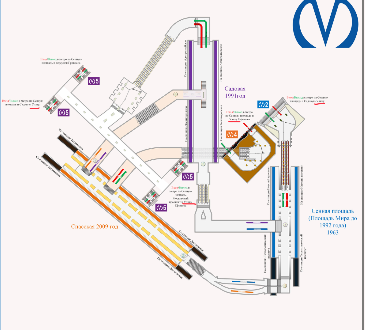 Лестницы выход в город и пересадки на М5 почему-то уехали в центр зала, хотя на Сенной всё как надо нарисовано.