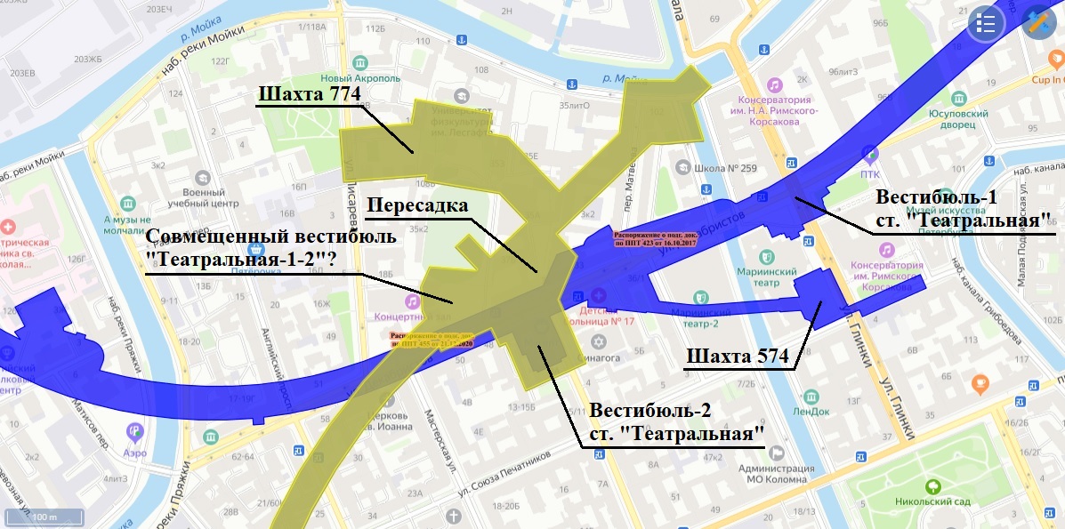 Да всё туда же - на место Дома Быта. А второй торец на "Театральной-1" может стать выходом и попозже - Гергиев с Бегловым не вечные. А вообще расположение станций очень похоже на пересадку "Пушкинская"-"Звенигородская" и переход может быть таким же, но ещё с наклоном.