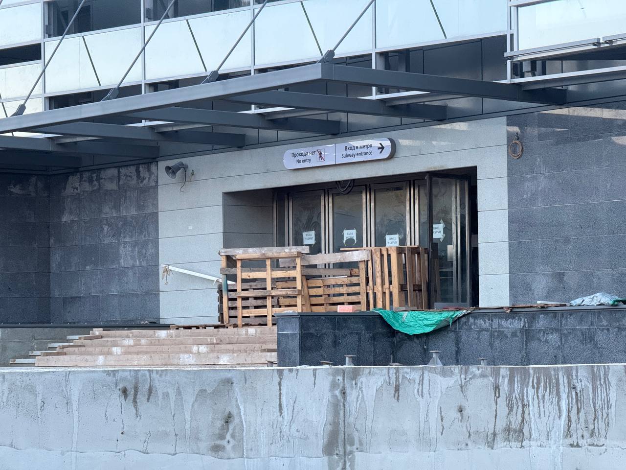 Так выглядит вестибюль станции «Юго-Западная» Красносельско-Калининской линии Петербургского метрополитена со стороны жилого комплекса строящегося на противоположной стороне улицы Маршала Казакова.