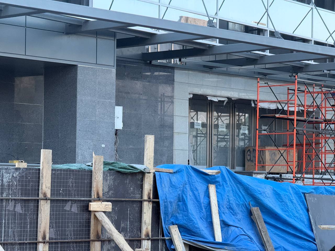 Продолжается установка каркаса станционных дверей.