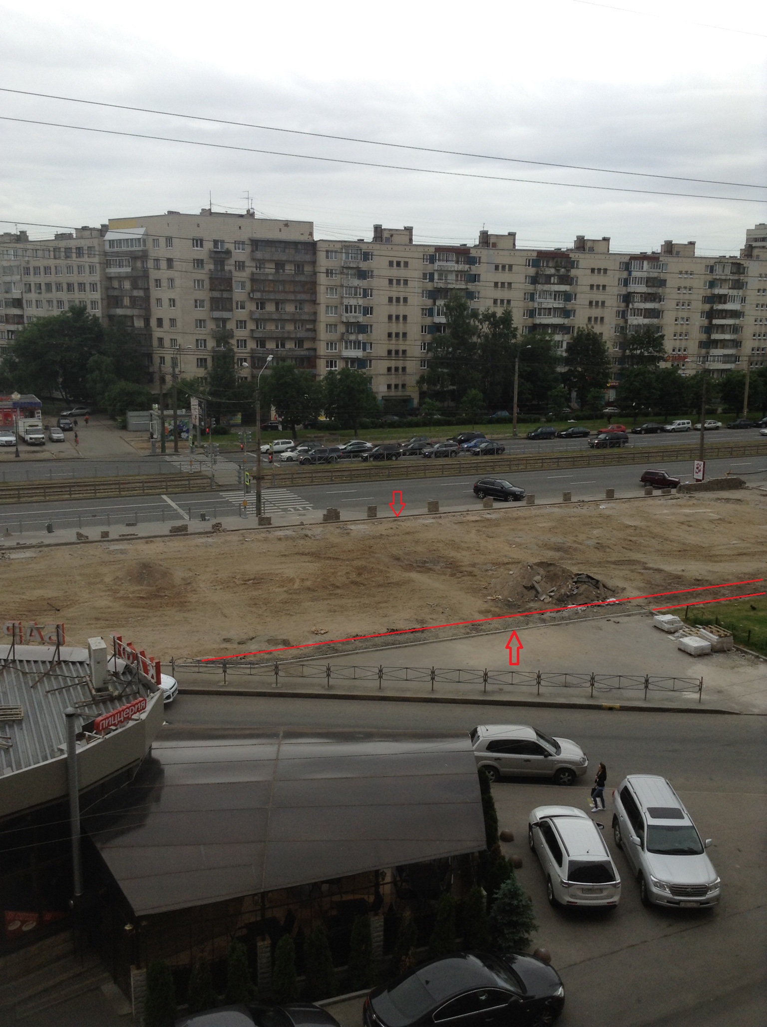 , но и не коренной петербуржец, поэтому слово "поребрик" не жалую - не обижайтесь). На ближней части снимка красными линиями обозначен участок, где раньше лежал асфальт.Что тут будет? - сложно сказать, но похоже, что новое капитальное строительство пока не планируется. Судя по всему, будет либо газон, либо заложат всю площадку брусчаткой. Хотя.. посмотрим..
