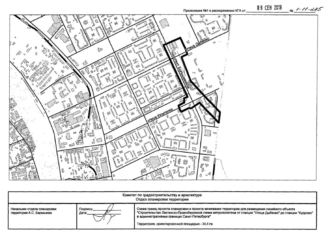 9 сентября 2019 г. подписано распоряжение Комитета по градостроительству и архитектуре № 1-11-275 "О подготовке документации по планировке территории для размещения линейного объекта "Строительство Лахтинско-Правобережной линии метрополитена от станции "Улица Дыбенко" до станции "Кудрово" в административных границах Санкт-Петербурга". Срок подготовки документации по планировке территории - 10.09.2020 г.
