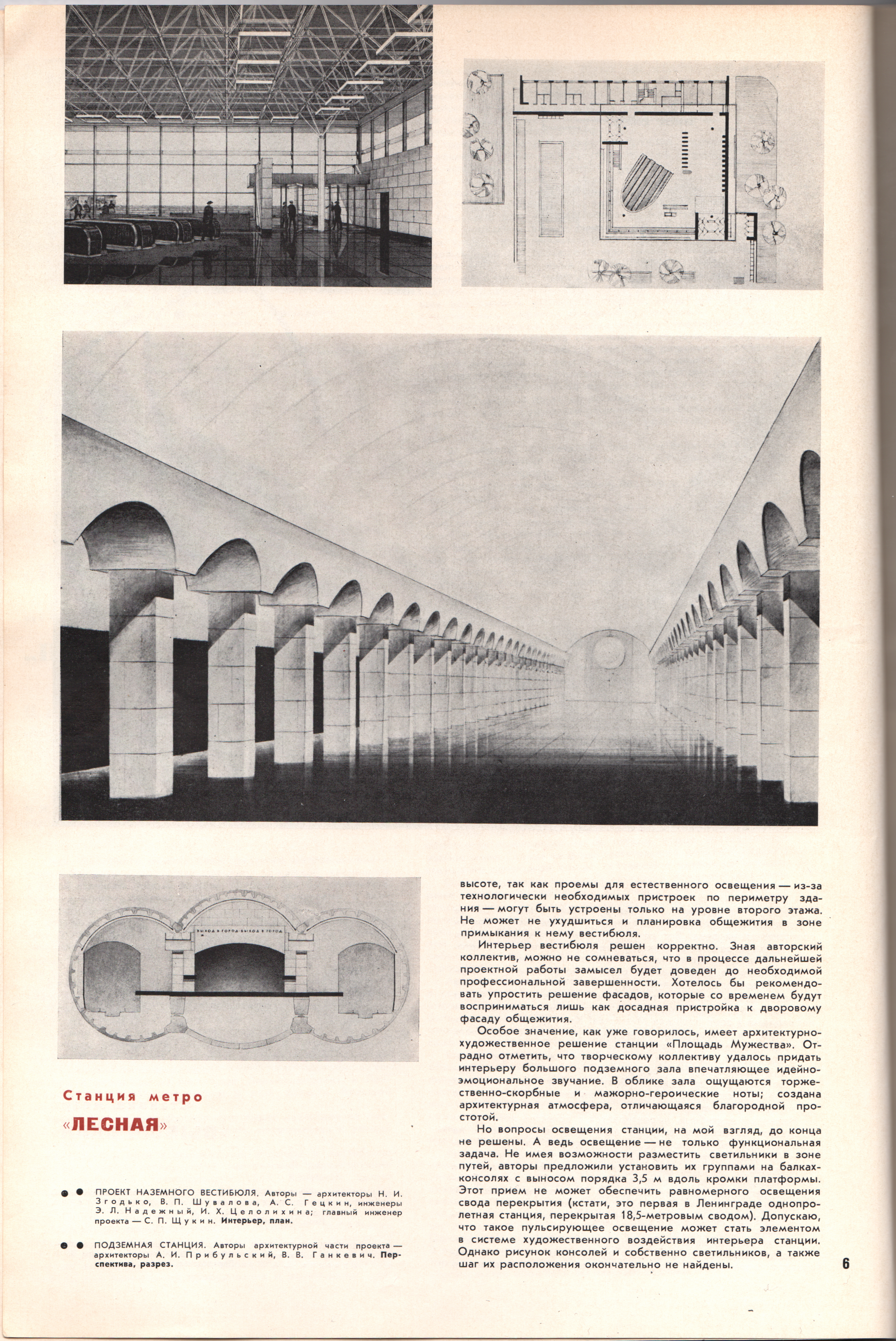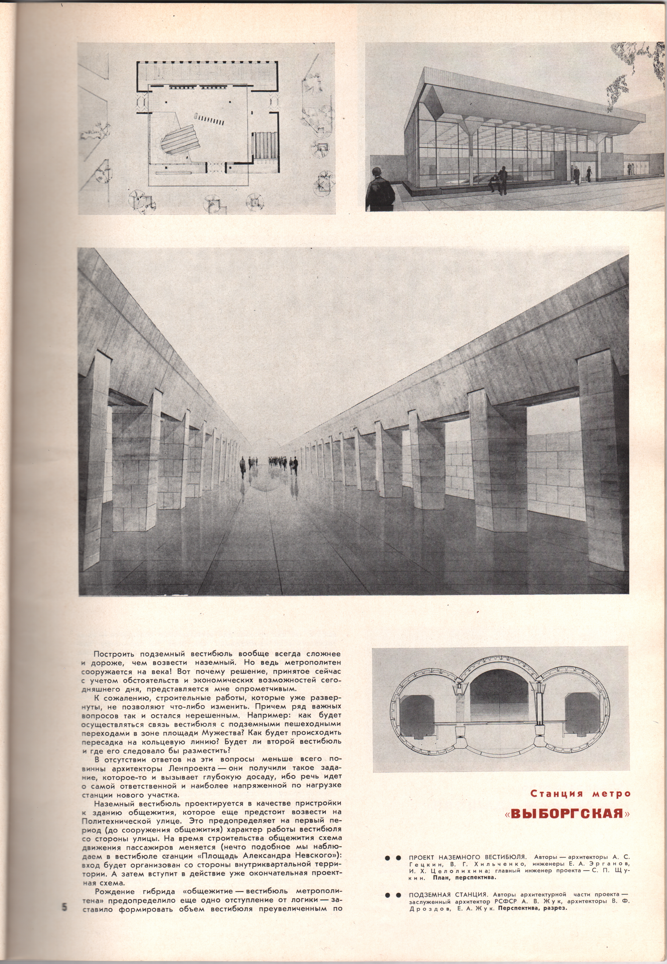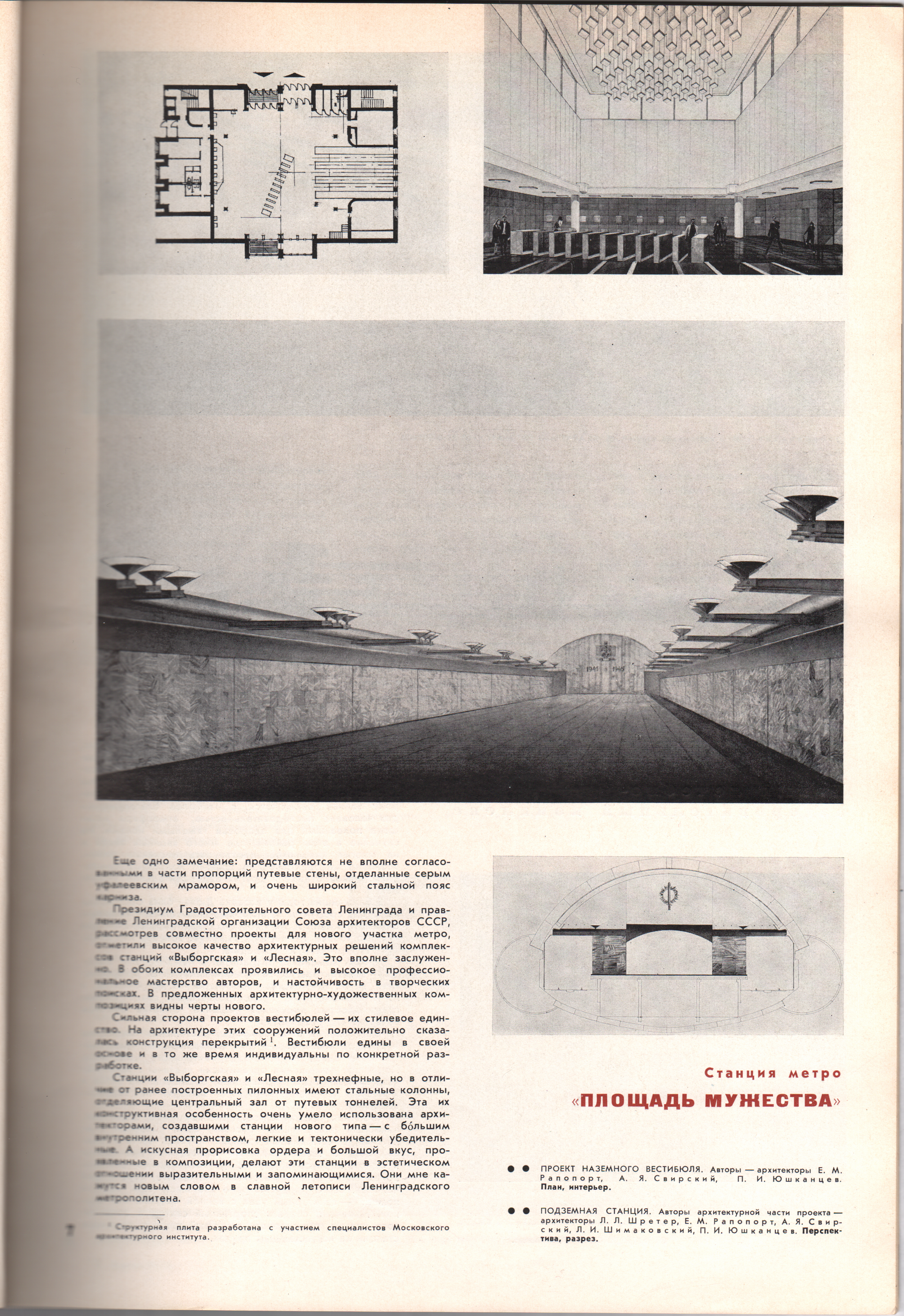Есть у меня замечательная коллекция замечательного журнала «Строительство и архитектура Ленинграда». А в №9 1973 года есть не менее замечательная статья, посвящённая пусковому участку «Выборгская» — «Площадь Мужества». Первому Размыву ещё только предстоит случиться, поэтому открывать планировали три станции, а не две. И ещё больше эскизов, отсканированных в 300 dpi, дабы их можно было рассмотреть в мельчайших деталях (поэтому файлы тяжеловаты)