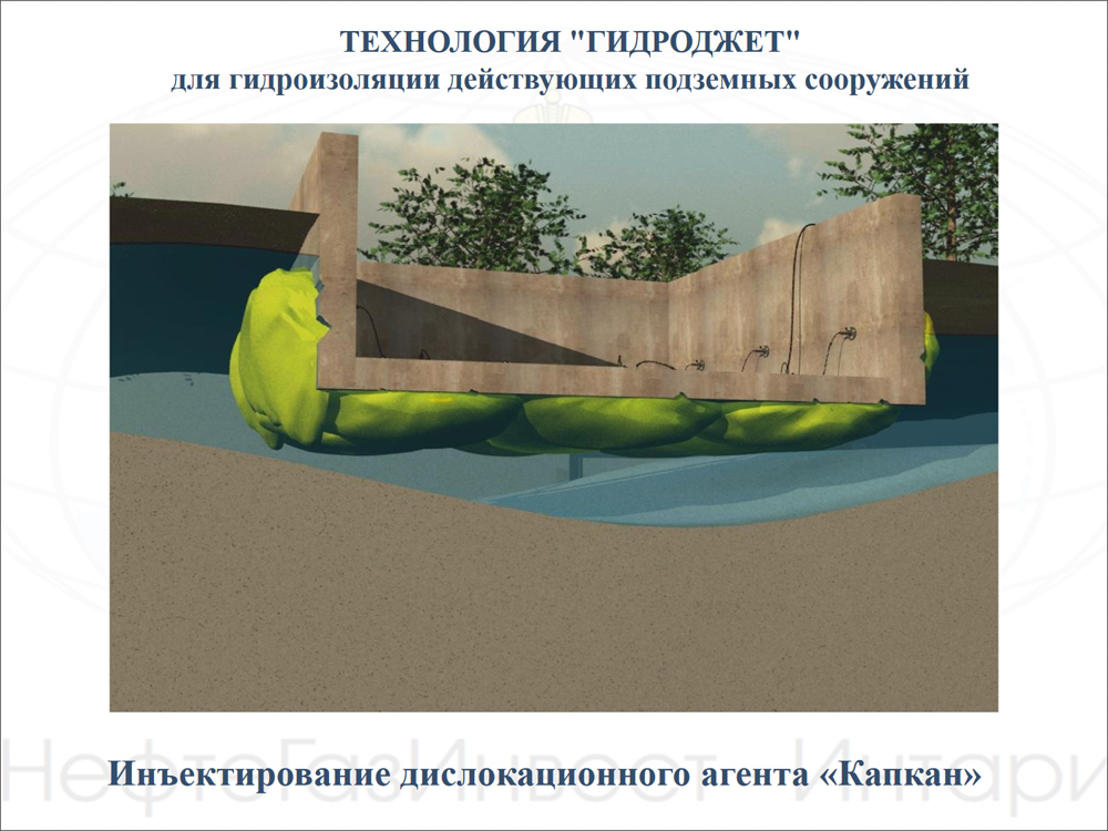 Спустя несколько месяцев, на заседании штаба по метростроению в начале июля, название «НефтеГазИнвест-ИНТАРИ» всплыло вновь. Как указано в сообщении городской администрации, подмосковная компания готова поставлять свою инновационную разработку на объекты подземки. Судя по презентации на сайте фирмы, сама технология называется «ГидроДжет», а материал – «Капкан». Он представляет собой гидрогель, который нужно нагнетать под фундамент подвалов или зданий, за тоннельную обделку. После взаимодействия с водой, как обещает разработчик, гель набухает, заполняет собой все свободное пространство и затвердевает.