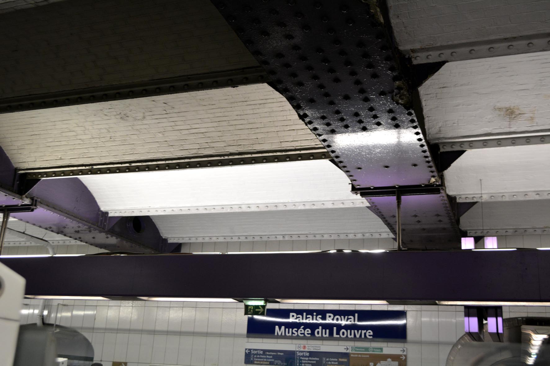 Для самого центра Парижа, оглядываясь на однотипность других станций, благодаря светильникам смотрится неплохо. Лестница наверх в зале с заклепками тоже смотрится интересно.