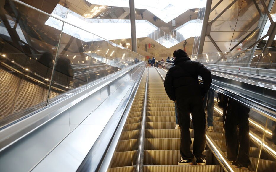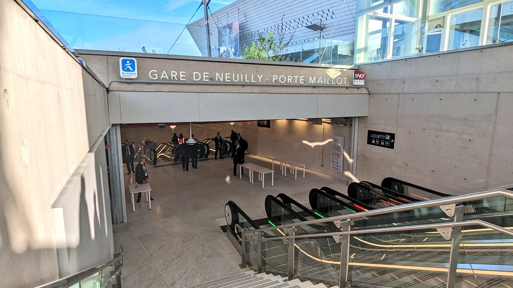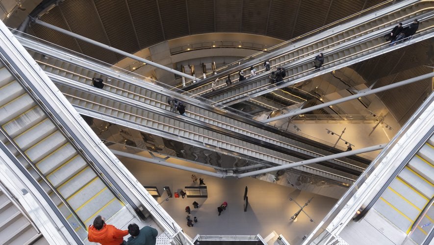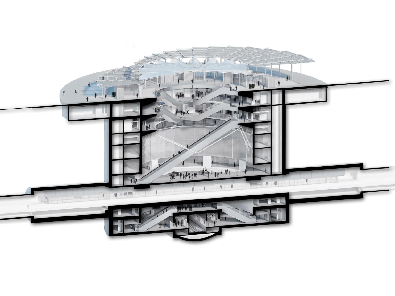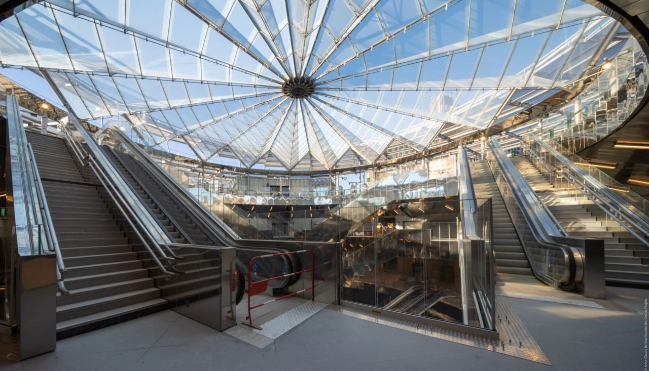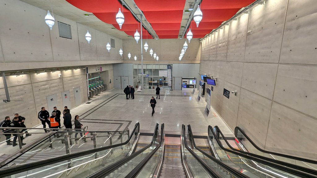 Каскад эскалаторов, ведущий на платформы с поверхности, выглядит сложным, но длина эскалаторов очевидно ограничена диаметром котлована, а подъём и спуск полностью механизированы как лифтами, так и эскалаторами.