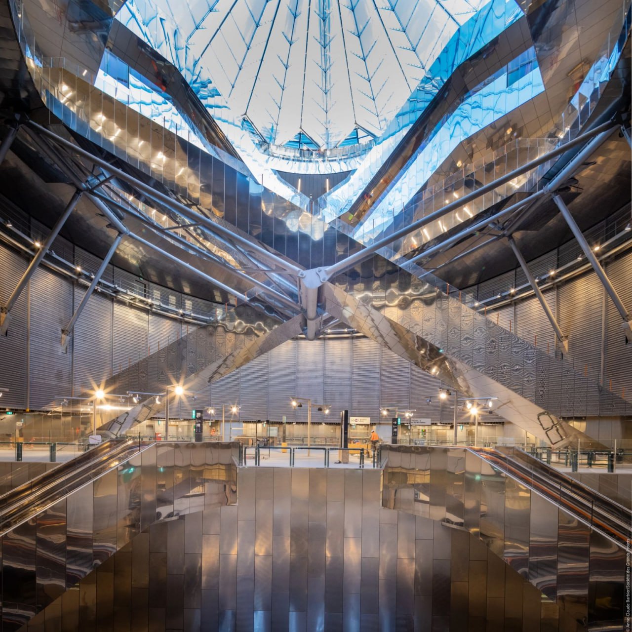 Роскошна и архитектура самой станции, сплетения эскалаторов придают особую футуристичность её облику. Автора станции, мы с Вами, кстати, хорошо знаем. Это Доменик Перро. Тот самый, по проекту которого должны были строить Новую Мариинку, но у наших строителей оказались «лапки».