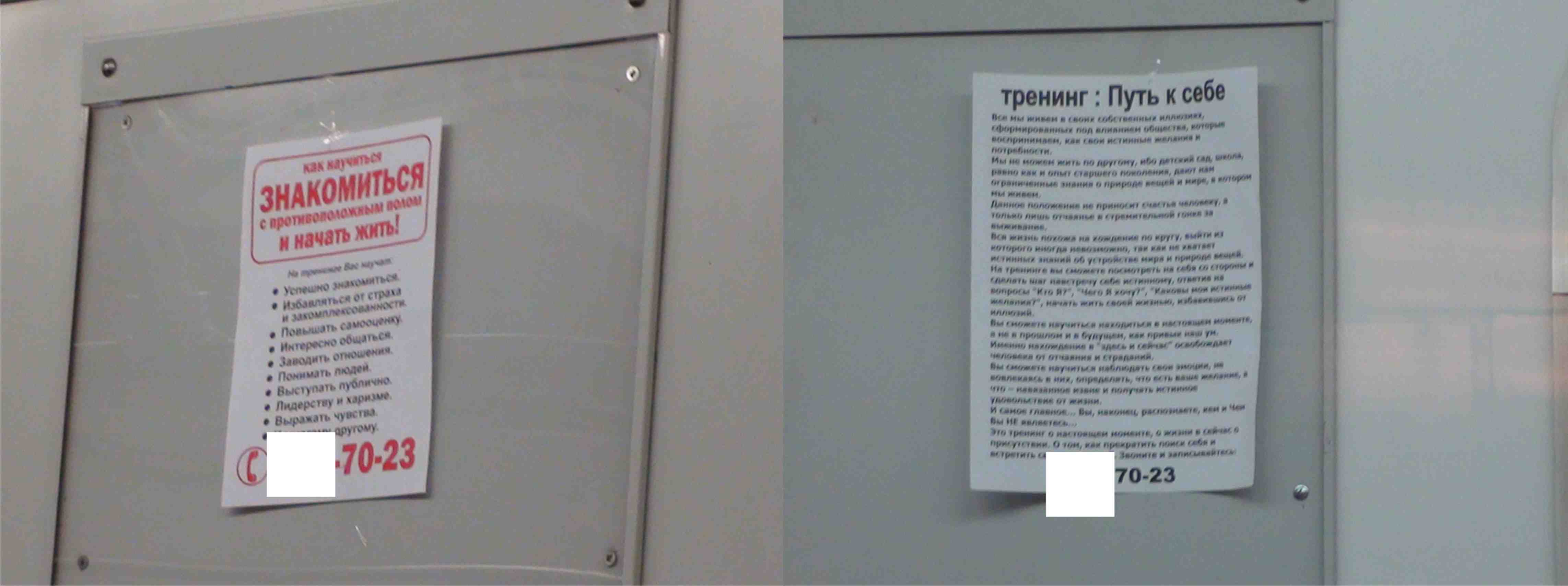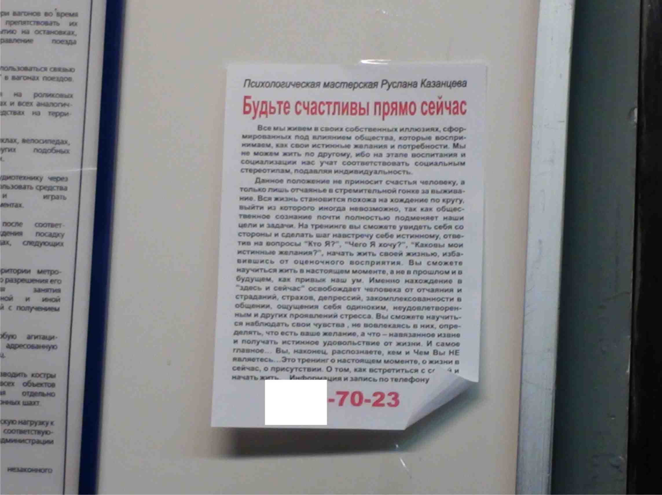 На МПЛ засилие нелегальной рекламы. Судя по всему какая-то секта. Днём просто чудовищное количество этих листовок. В каждом вагоне заполнены все пустые мини-стенды (а иногда и с рекламой). К вечеру большая часть из них на полу, т.к. ветер сдирает с мини-стенда скотч, да и сознательные граждане (в основном за 50) яростно сдирают их (неоднократно видел). Пока что два вида листовок. Рекламируется судя по всему сектантский контент. Фигурирует один и тот же телефон.