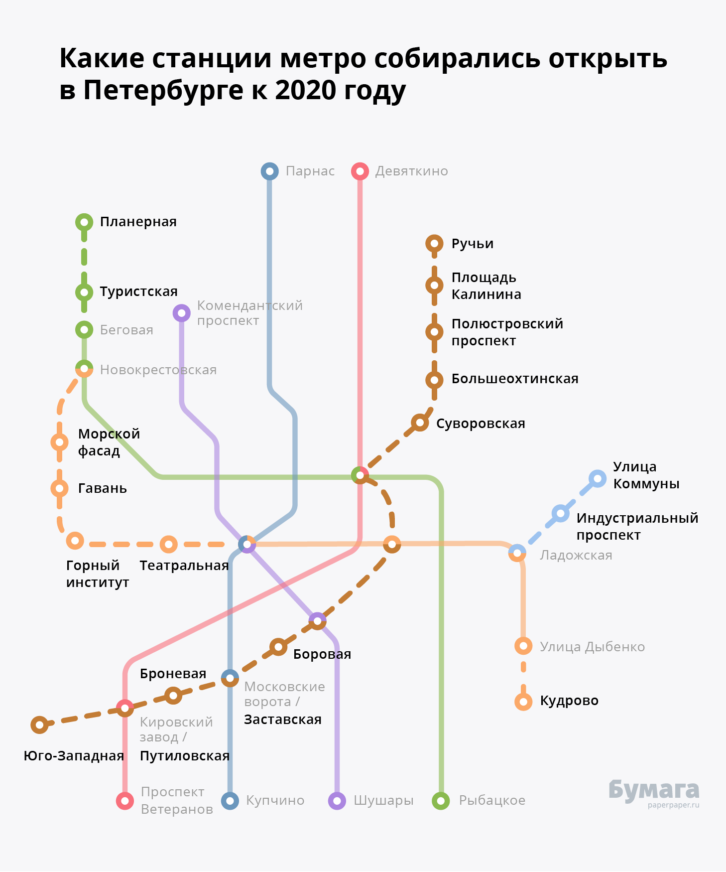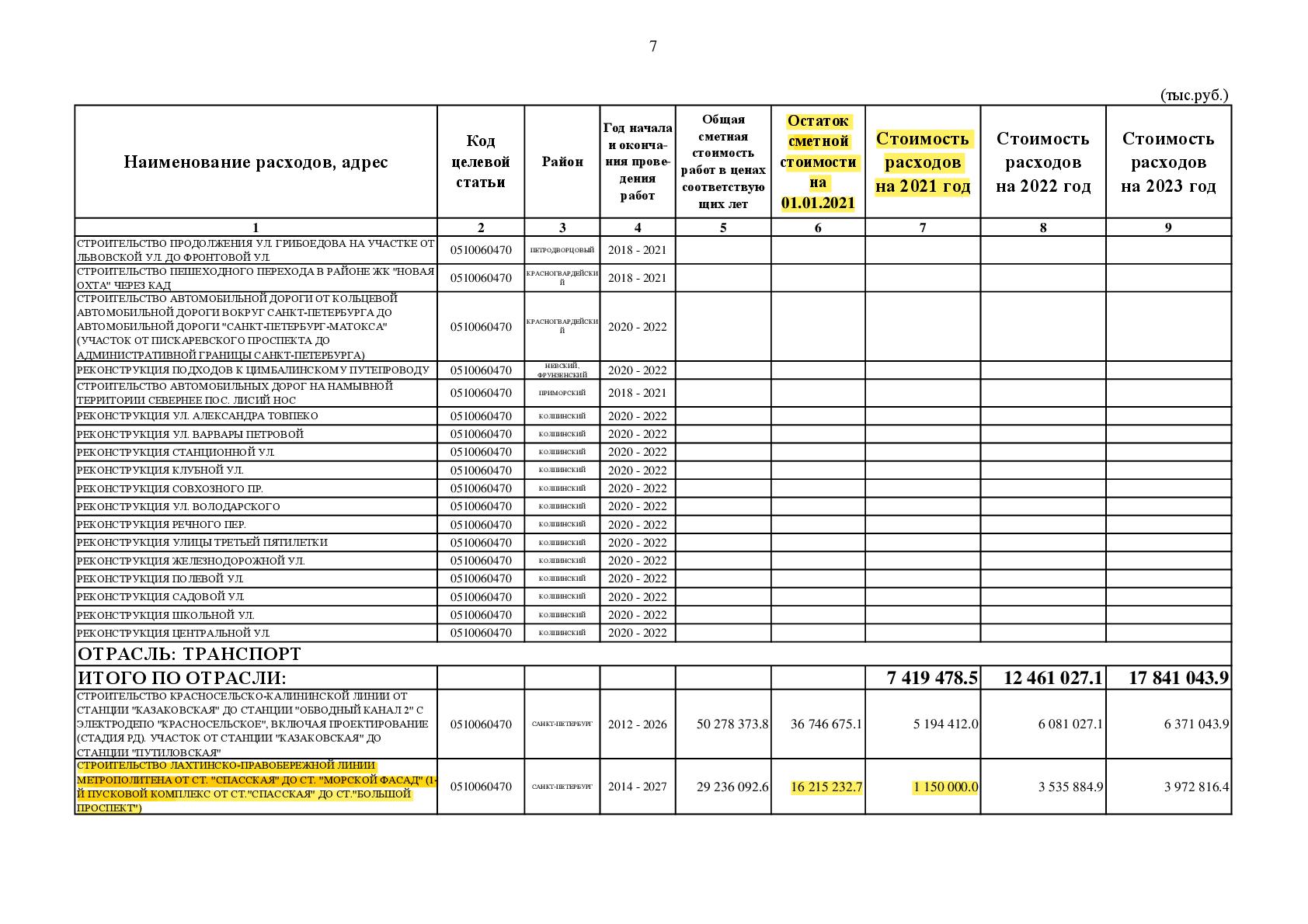 Согласно документу в 2021 году со строительства Красносельско–Калининской линии (ККЛ, "коричневая" ветка) от "Путиловской" до "Юго–Западной" срежут почти 1,4 млрд рублей, в результате чего бюджет объекта с 6,1 млрд сократится до 4,7 млрд рублей. Финансирование Лахтинско–Правобережной линии (ЛПЛ, "оранжевая" ветка) на участке от "Спасской" до "Горного института" уменьшится до 2 млрд рублей в текущем году, объект потеряет почти 400 млн рублей.