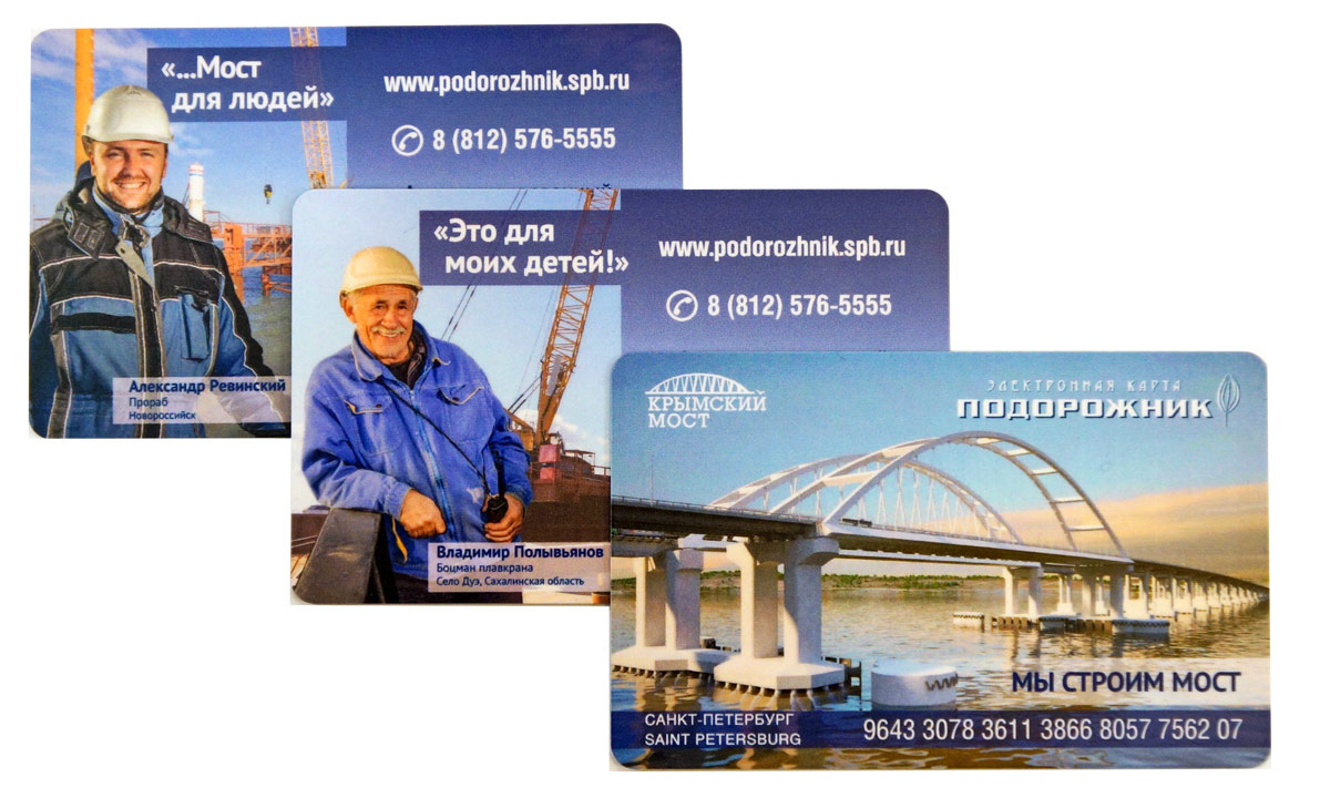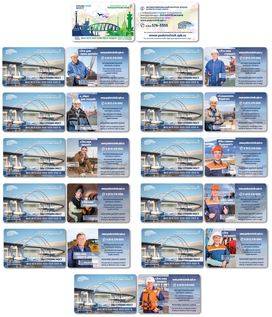Карты выпускаются в поддержку кампании «Мы строим мост», которую проводит Информационный центр «Крымский мост». На лицевой стороне билета размещено проектное изображение судоходного пролёта Крымского моста. На обратной стороне – фотография строителя с указанием его имени и фамилии, а также специальности. Рядом с фотографией строителя – фраза, характеризующая его отношение к участию в проекте или значимости проекта в жизни героя. Всего на «Подорожниках» появятся фотографии 11 строителей.