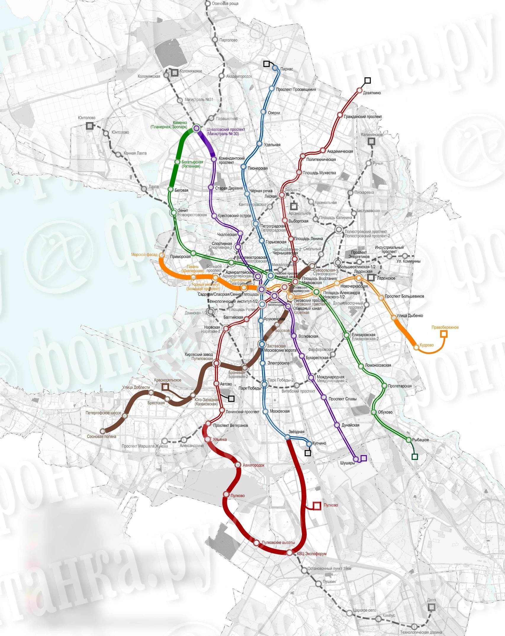 Схема из статьи Фонтанки Ну, давайте считать. Какие станции метро Смольный планирует построить до 2030 года: https://www.fontanka.ru/2025/05/24/75498854/.